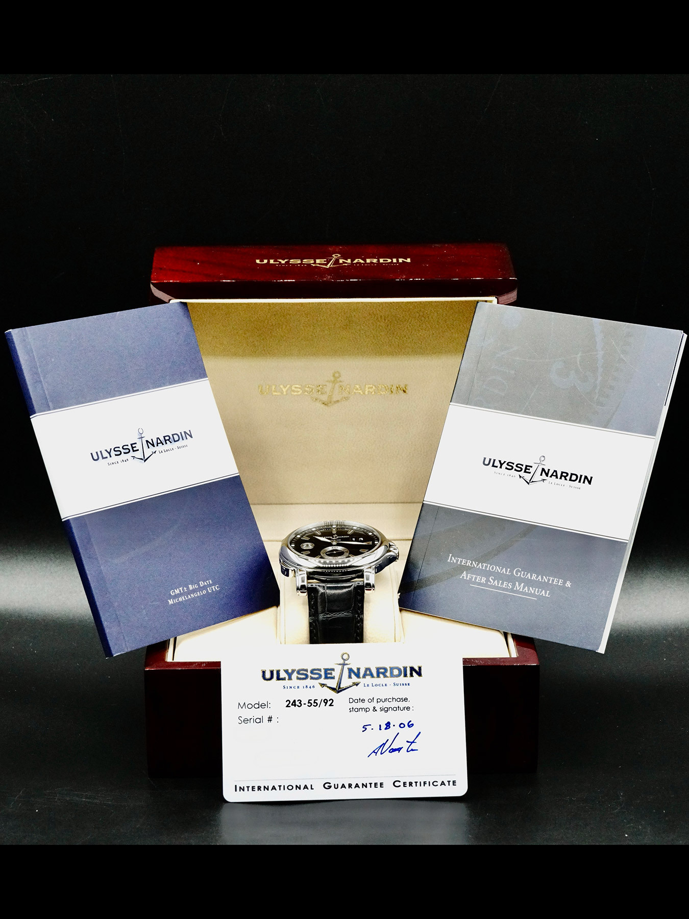 This Ulysse Nardin Dual Time 243-55/92 is in EXCELLENT condition. This watch includes its original box, instruction manual, and international guarantee certificate dated for May 2006.