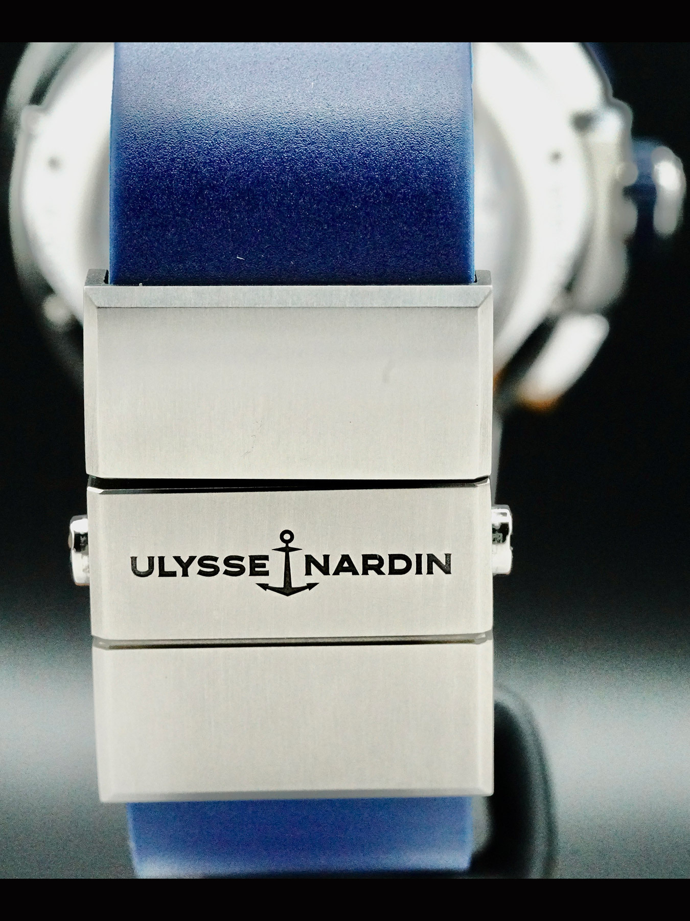 This Ulysse Nardin Marine Chronograph features a 43mm stainless steel case with a display case back on a blue rubber strap. This watch also sports a white dial with luminous blue hands and Roman numeral dial markers covered by scratch resistant sapphire crystal.