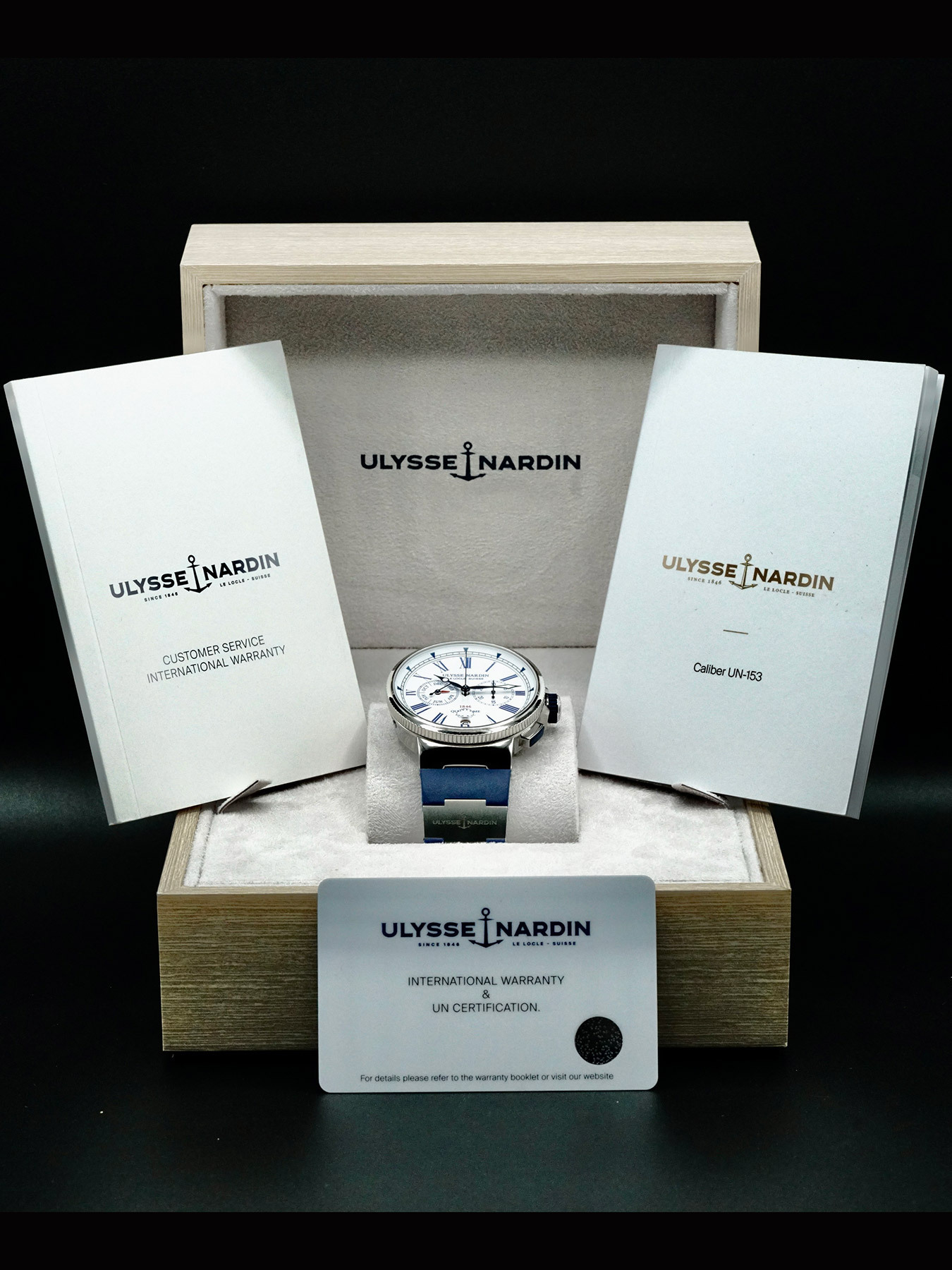 This Ulysse Nardin Marine Chronograph 1533-150/E0 is in EXCELLENT condition. This watch includes its original box, instruction manual, and international warranty & UN certification card. No date on warranty card.