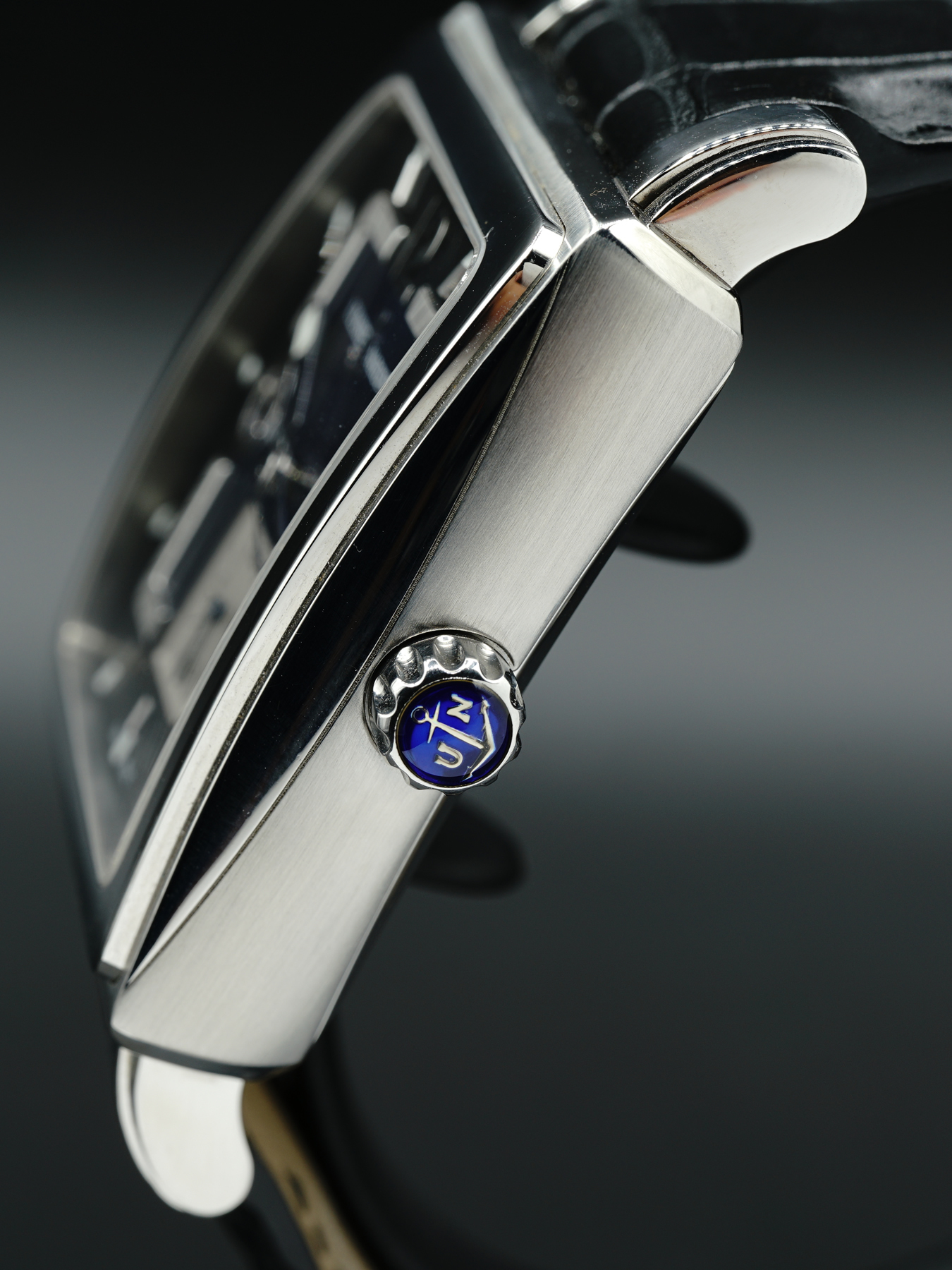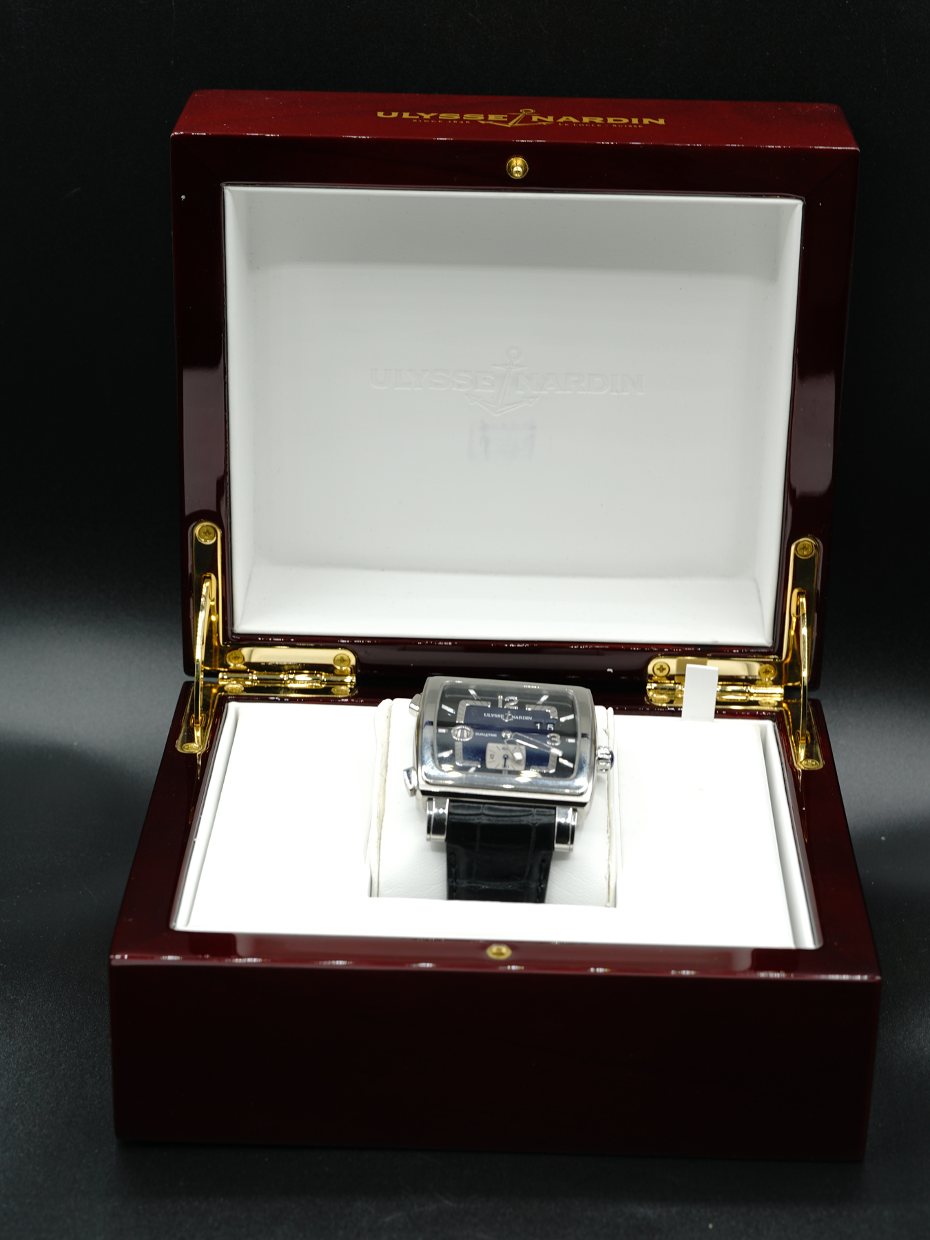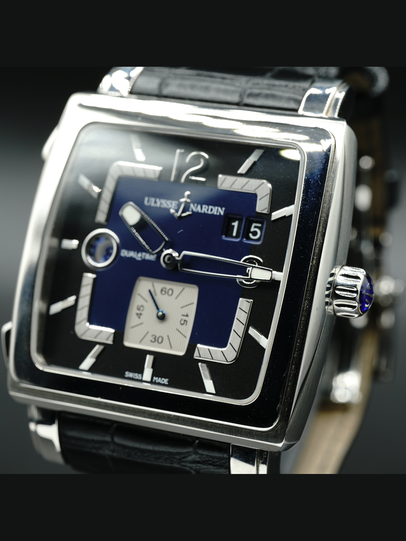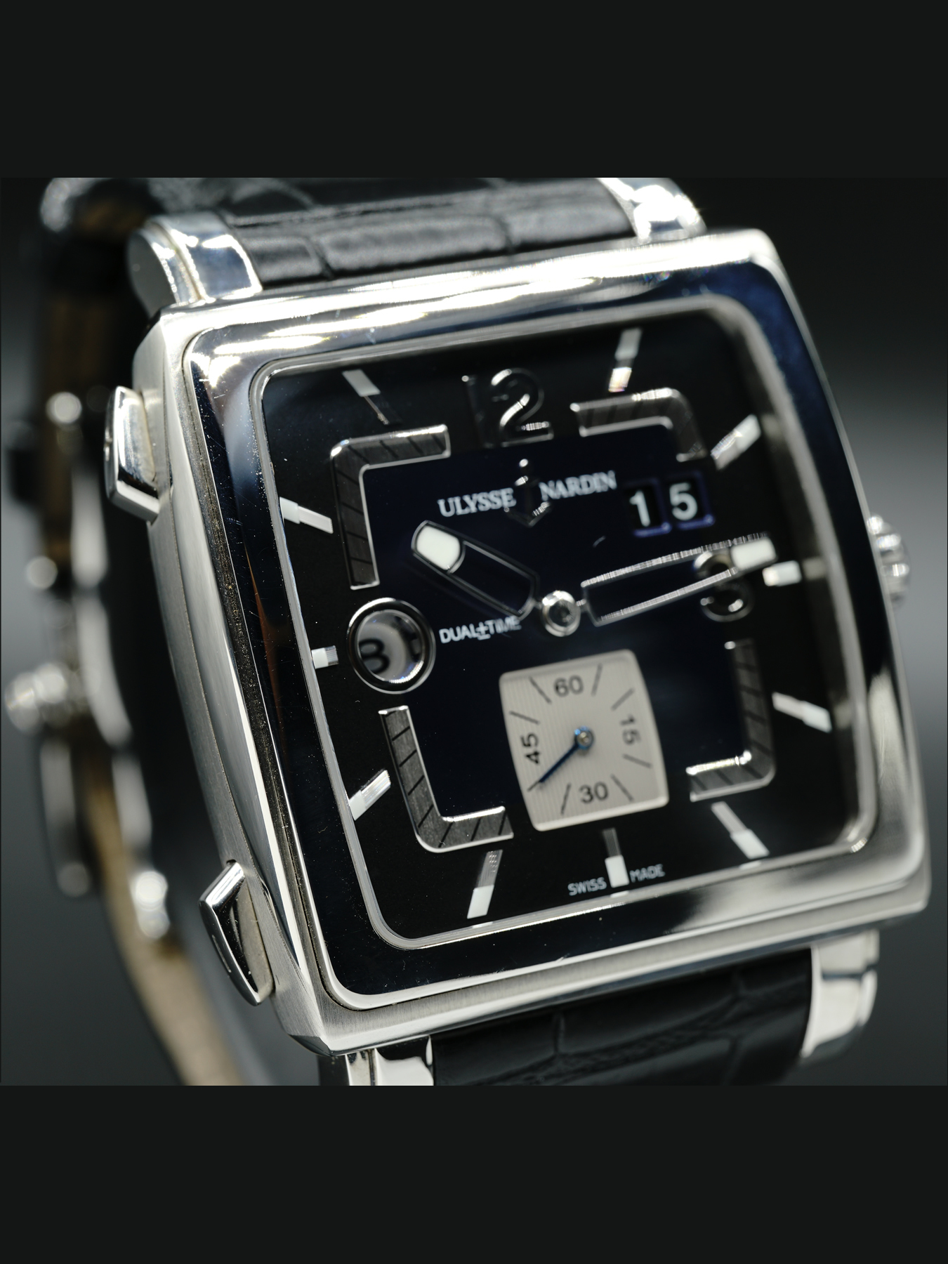 This Ulysse Nardin Quadrato Dual Time Steel is in GREAT condition. This watch sports a stainless steel case with a black leather strap. Fixed stainless steel bezel. Blue dial with luminous silver-tone hands and index hour markers. This watch comes with its original box, papers, and international warranty card dated for March 2016.
