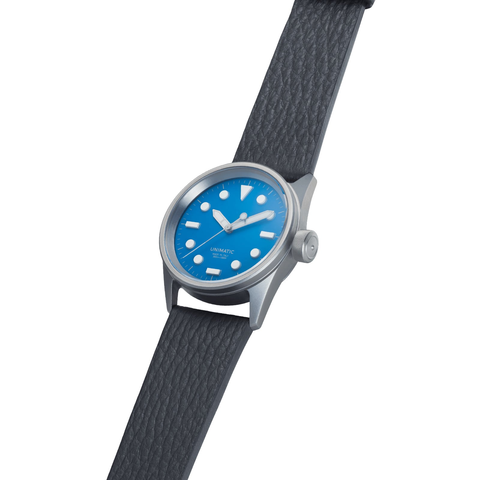 The UNIMATIC Modello Cinque ref. UT5-AS is a Made in Italy quartz all-round watch. It features an Alpine Sky dial with hand-applied 3D UNILIGHT markers, dark gray open second rail, and dial trims.