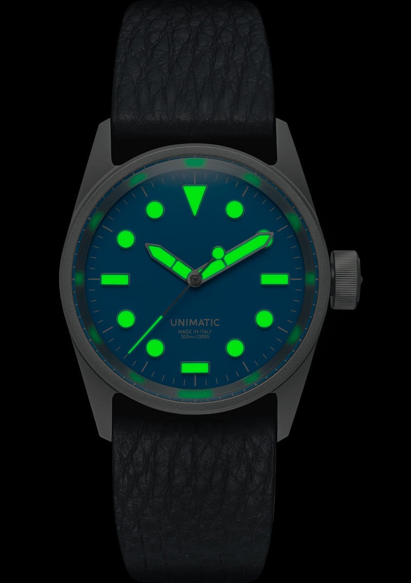 Timing accuracy is guaranteed by the Quartz VH31A movement with hacking second hand, fitted with a Made in Italy TPU anti-shock system. The watch comes on a fumo deer leather two-piece quick-release strap with sandblasted stainless steel hardware signed UNIMATIC, fitting 22mm lugs.