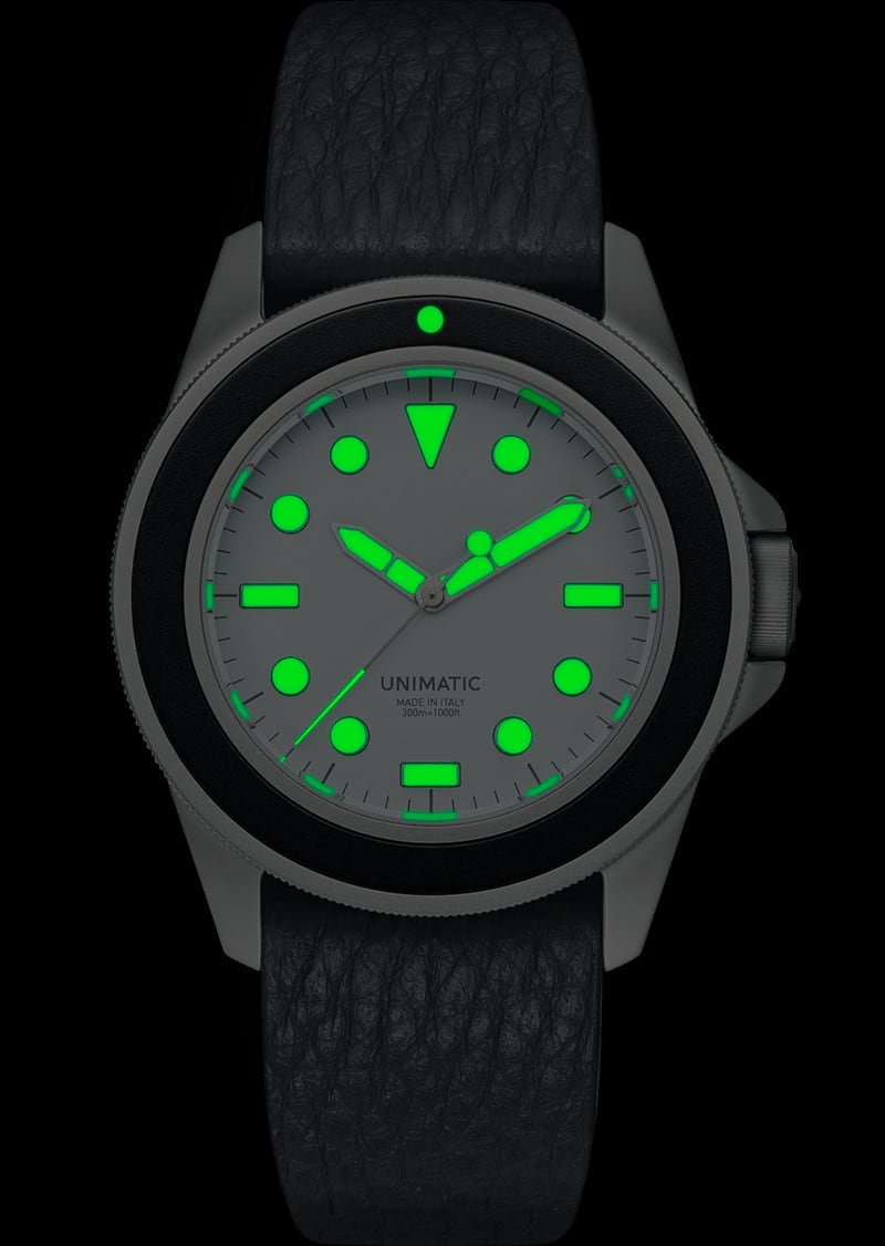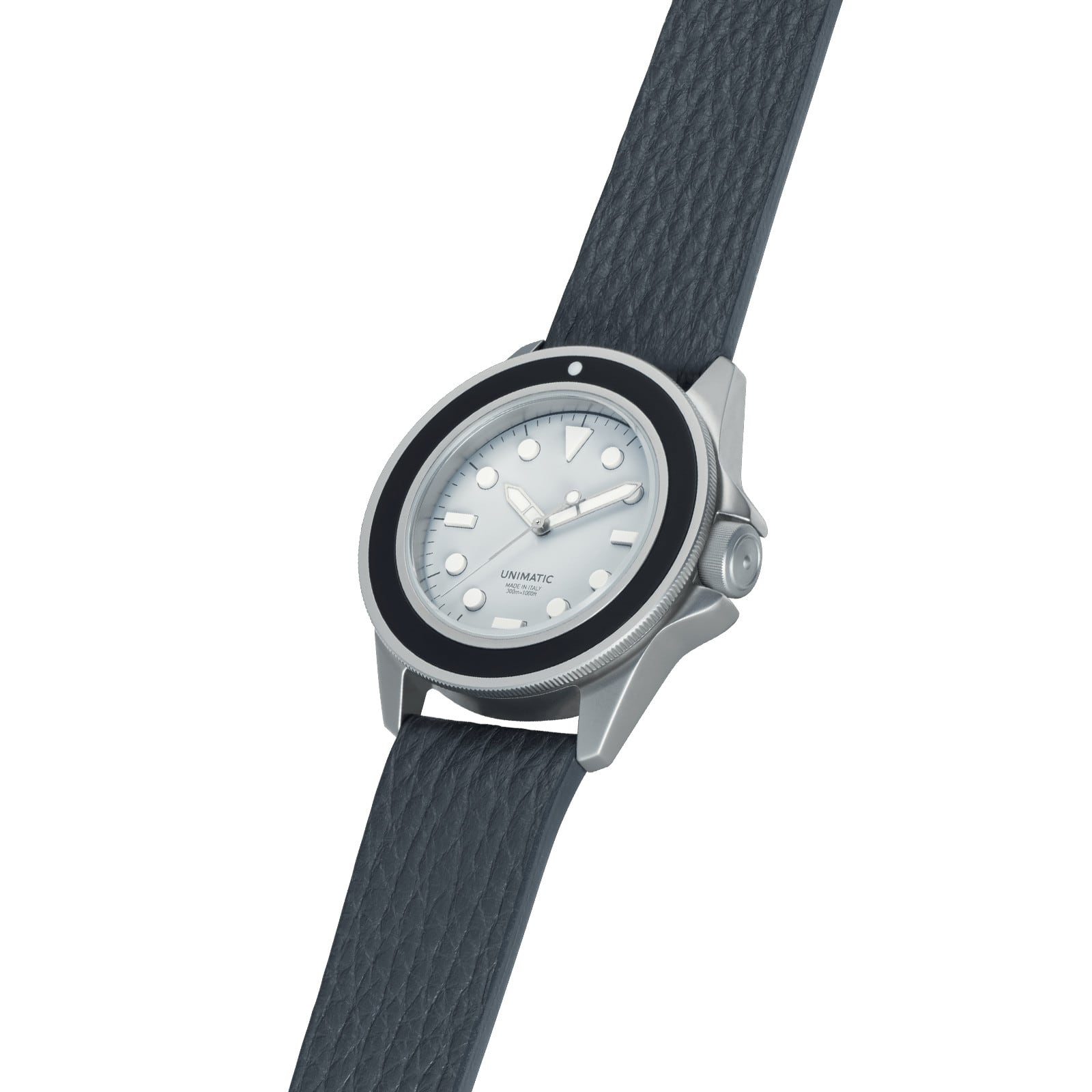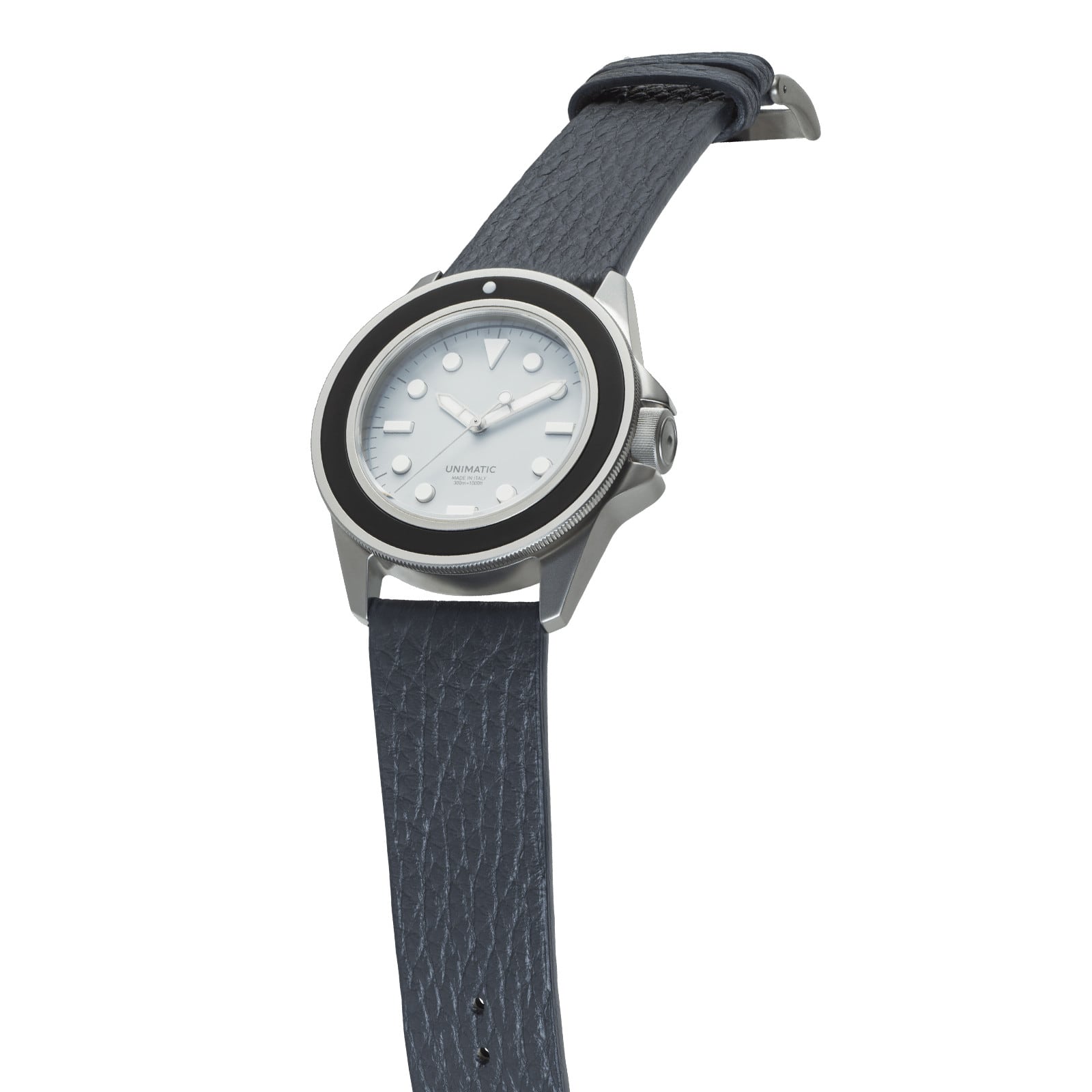 It comes on a fumo deer leather two-piece quick-release strap with stainless steel sandblasted hardware signed UNIMATIC, that fits in the 22 mm lugs.