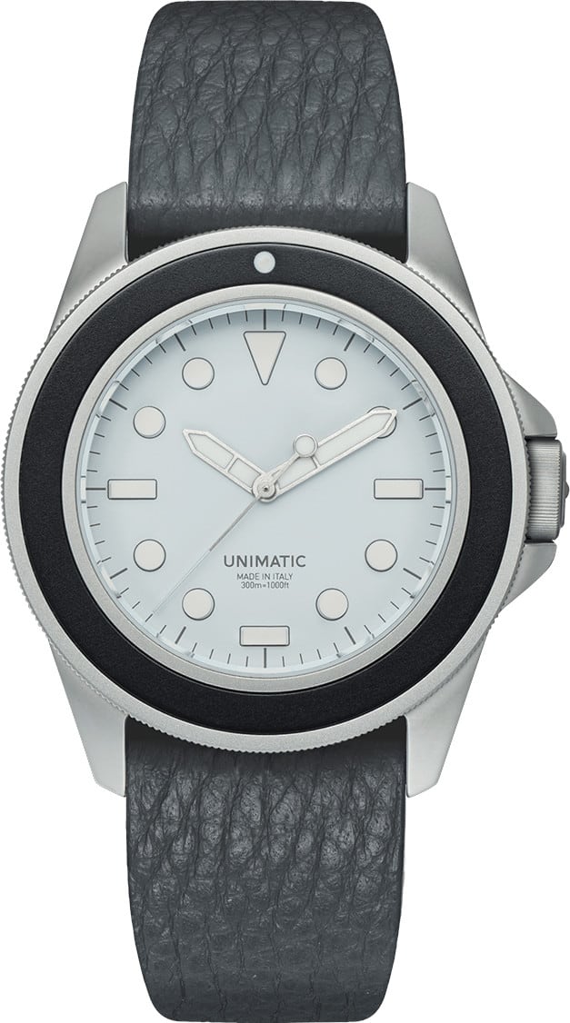 Modello Uno ref. UT1-GO is the Made in Italy UNIMATIC quartz dive watch. It features matte black bezel insert, glacier white dial with hand-applied 3D UNILIGHT markers, dark gray open second rail and dial trims.