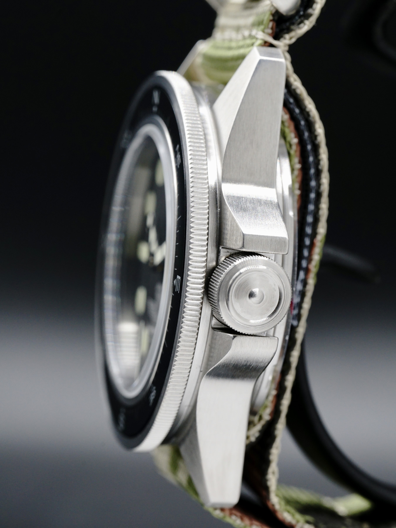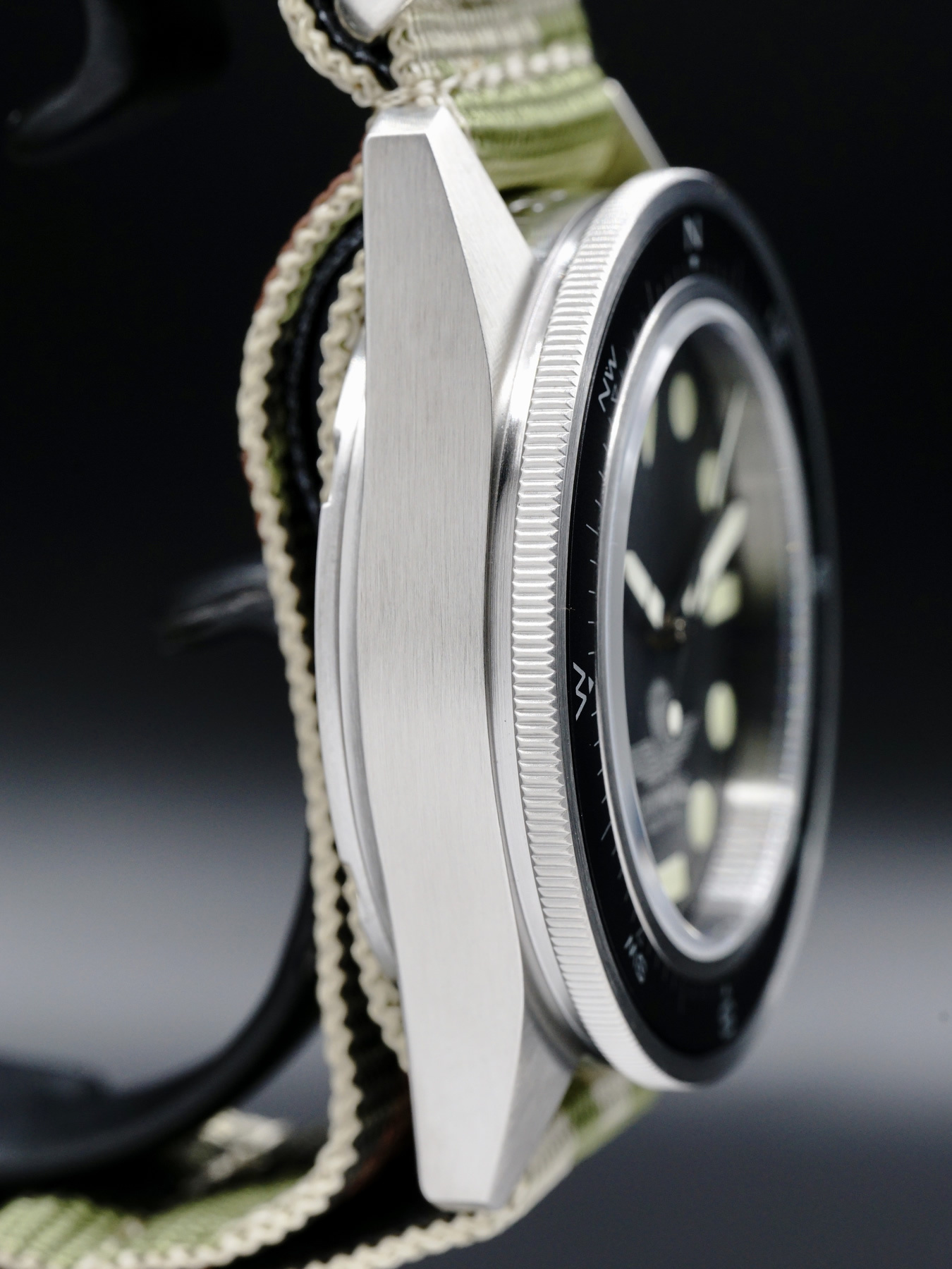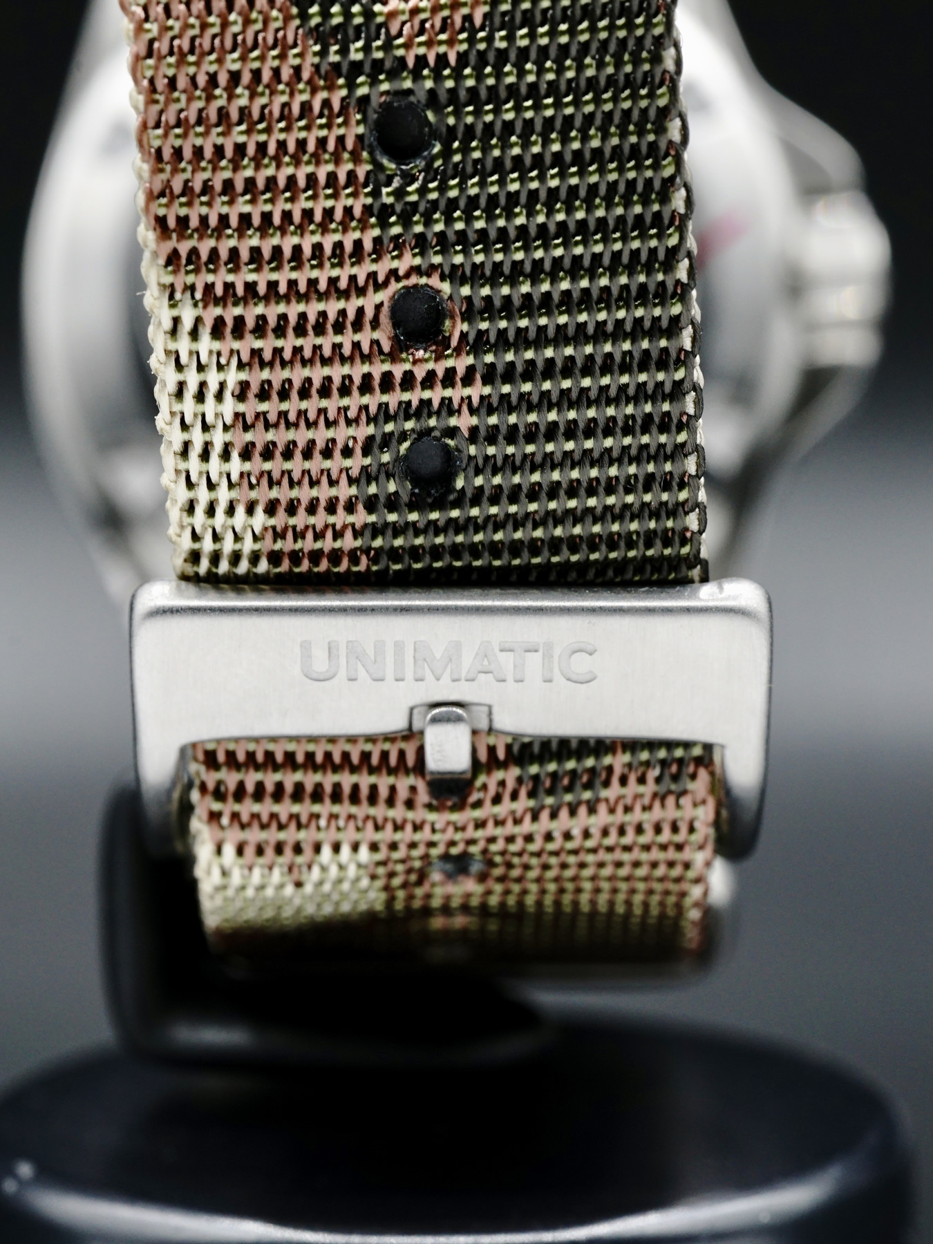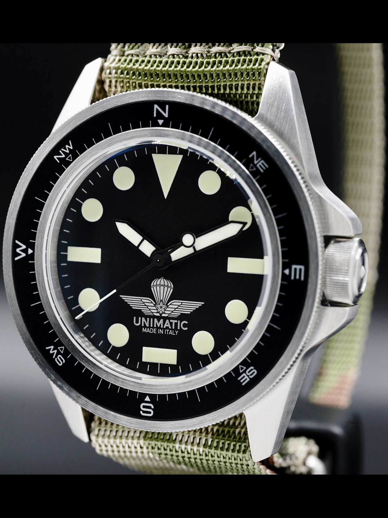 This Unimatic x Esercito Modello Uno features a 40mm stainless steel case with a brushed finish on a camouflage nylon NATO strap. This watch also showcases a matte black dial with superluminova hands covered by domed, anti-reflective sapphire crystal.