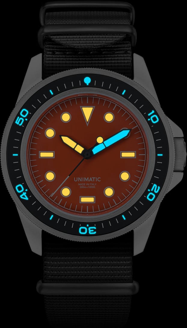 The PRODIVER’s matte ceramic bezel insert combines high-performance functionality with a refined tool-watch aesthetic. Lume-infused and scratch-resistant, it offers superior durability and visibility while maintaining tactile responsiveness for gloved operation. Designed with purpose, it reflects UNIMATIC’s dedication to utility, clarity, and long-term resilience.