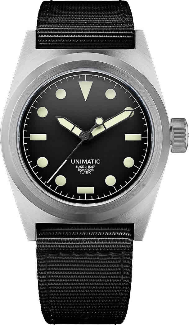 This Unimatic U2 Classic features a 38mm steel case on nylon strap. This watch also sports a black dial. Powered by a Mechanical Automatic Movement, Caliber Seiko NH35A. Water resistance up to 300 meters.