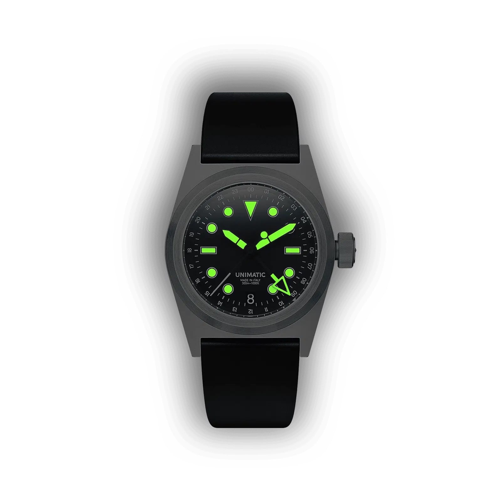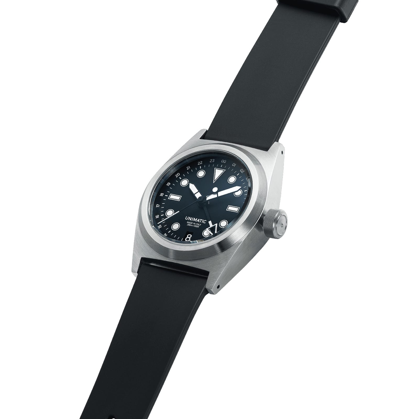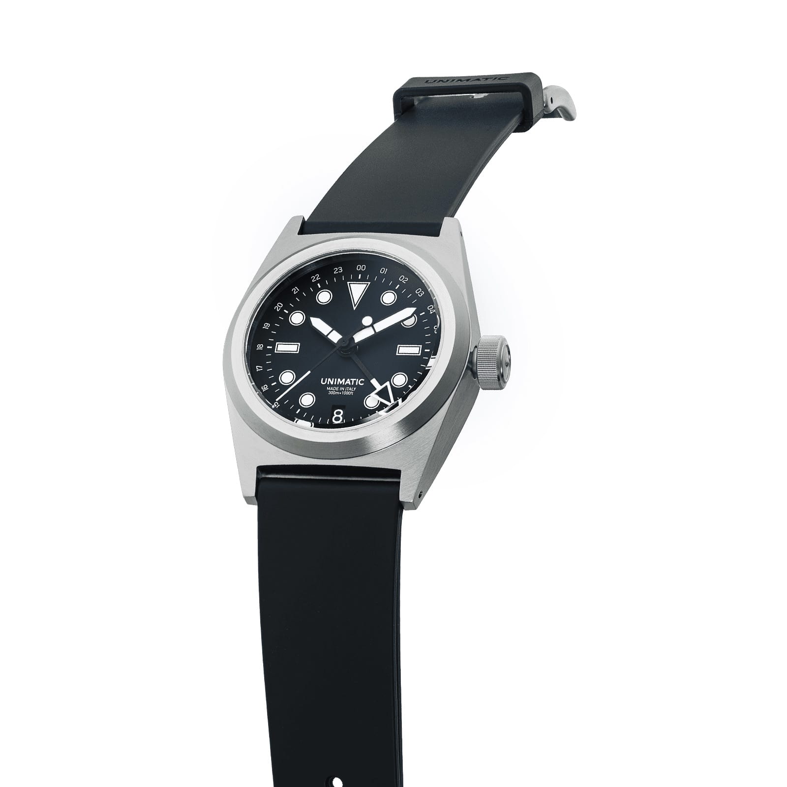 Inside, the NH34A automatic movement operates at 21,600 bph, with 41-hour power reserve and hacking second hand. The watch comes with a charcoal grey tapered 22-20mm TPU strap, stainless steel brushed hardware signed UNIMATIC, and quick-release system for easy strap changes.