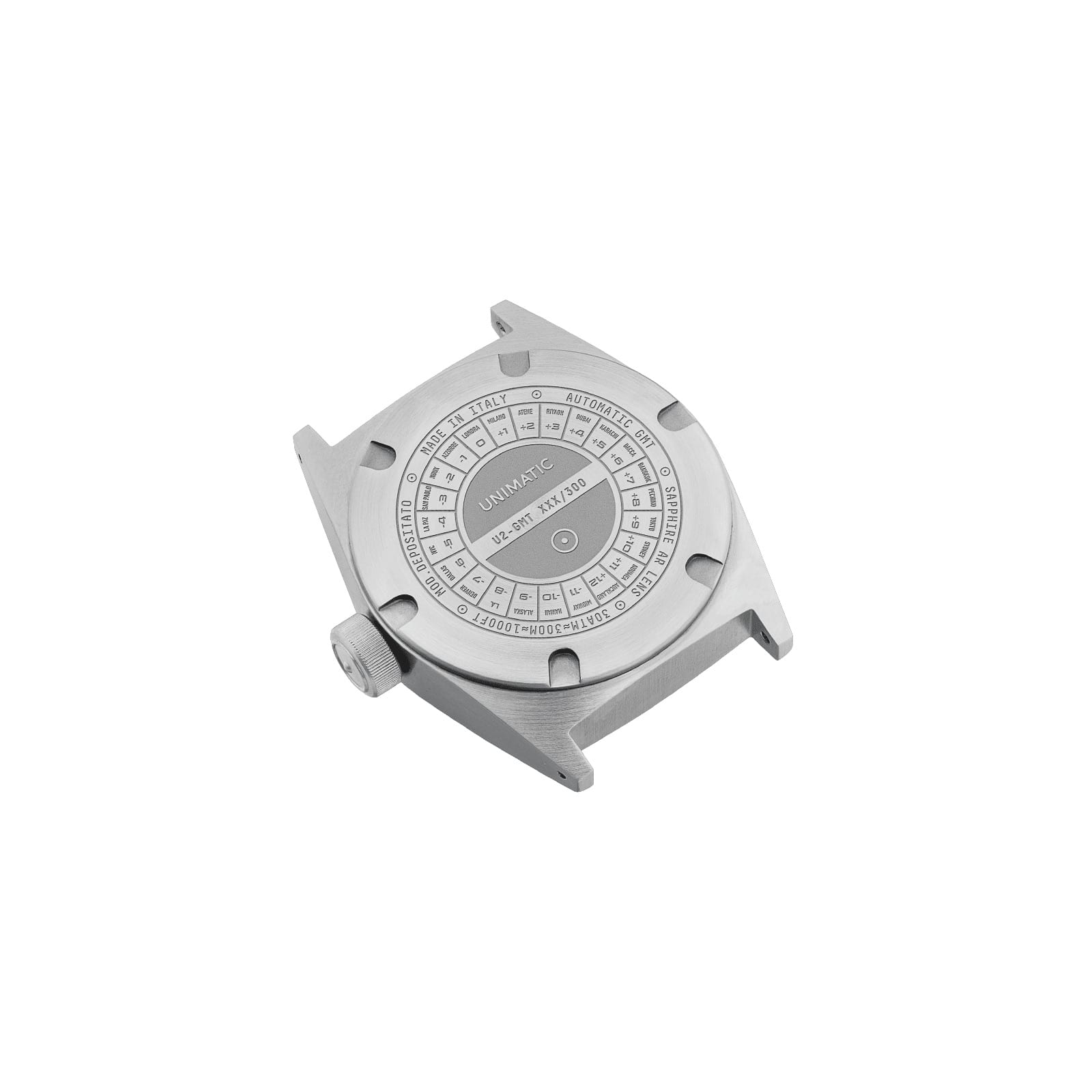 The caseback is engraved with UNIMATIC Timezone graphics and the individual progressive serial number. This timepiece is covered by a 2 year worldwide warranty.