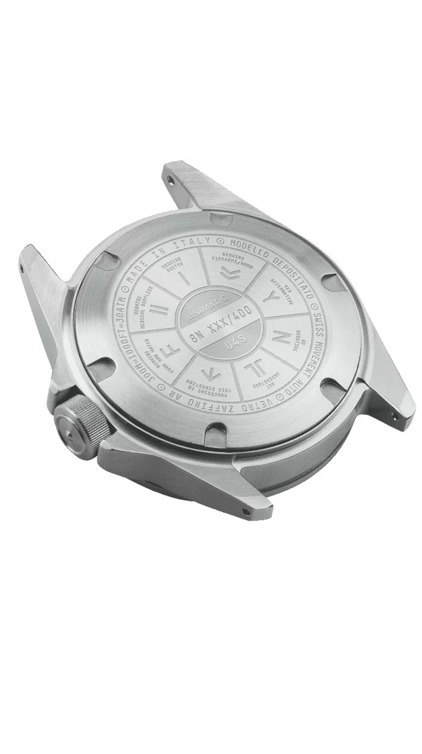 Introducing the Modello Quattro ref. U4S-8N, a sleek military watch proudly made in Italy. Its vintage navy dive dial features Super-LumiNova® GL light old radium, ensuring excellent visibility in any lighting condition. The gold metallic brushed ladder hands and reverse lollipop second hand, with a Super-LumiNova® GL light old radium white tip, provide precise timekeeping. The double-domed anti-reflective sapphire crystal enhances performance further. With a thin stainless steel case, screw-in caseback, and 8mm crown, this watch offers water resistance tested up to 30 atm. Powered by the Swiss-made automatic calibre Sellita SW200-1-b movement, it guarantees accurate timing. The watch includes a vintage navy TPU two-piece strap with brushed stainless steel hardware, as well as an extra vintage navy seatbelt NATO strap. Limited to 400 pieces, it features a unique edition number and is covered by a 24-month worldwide warranty.