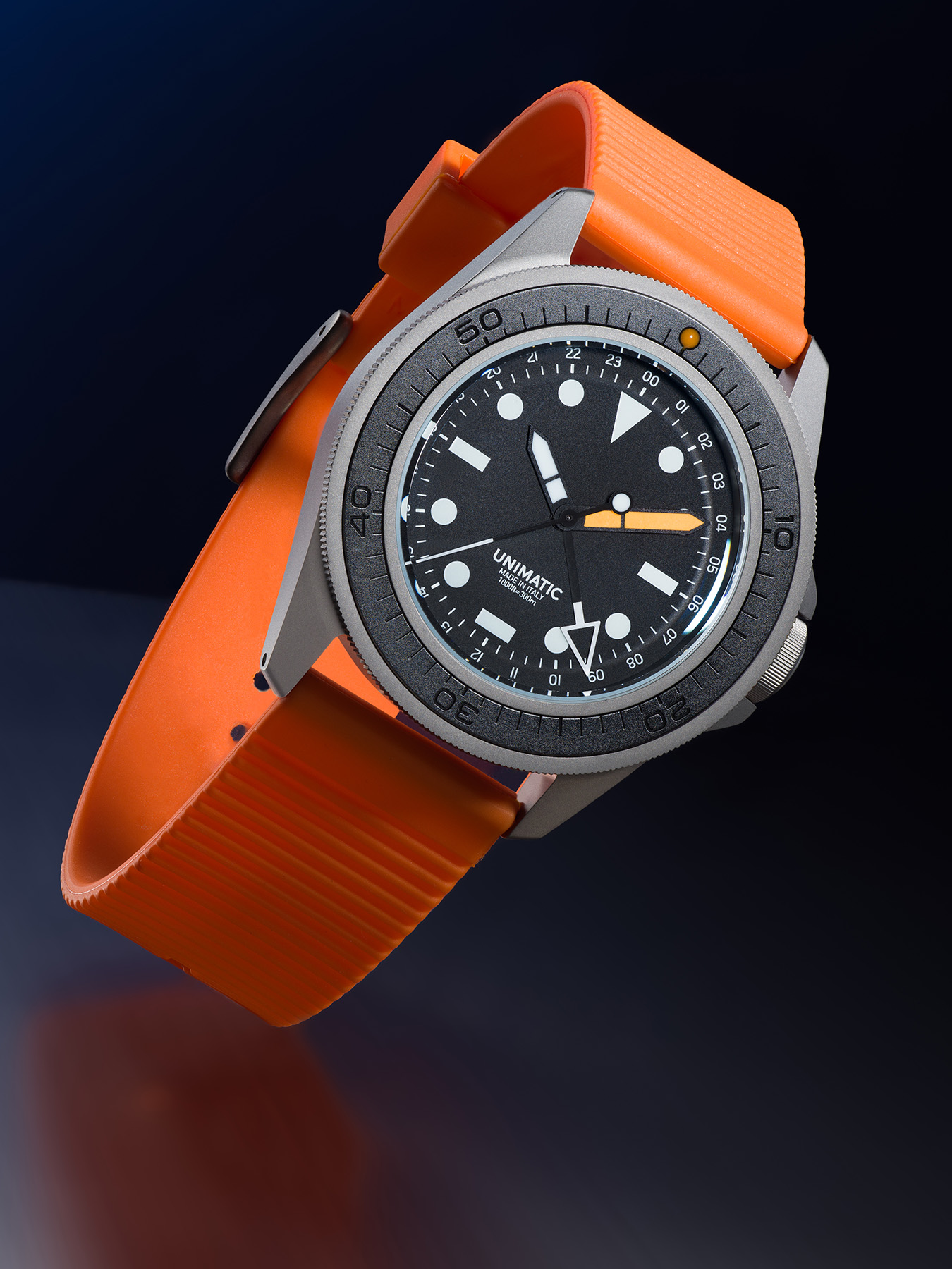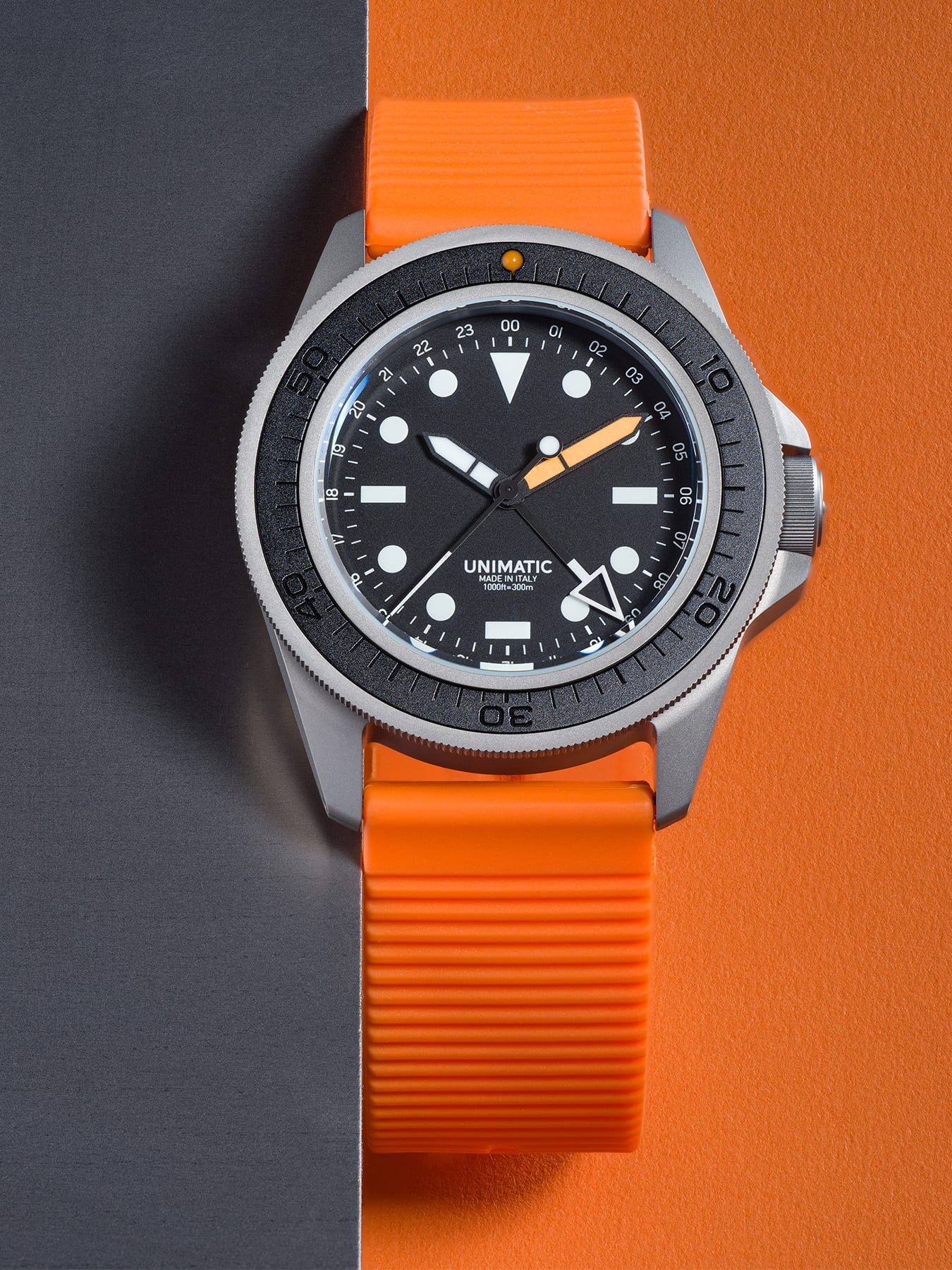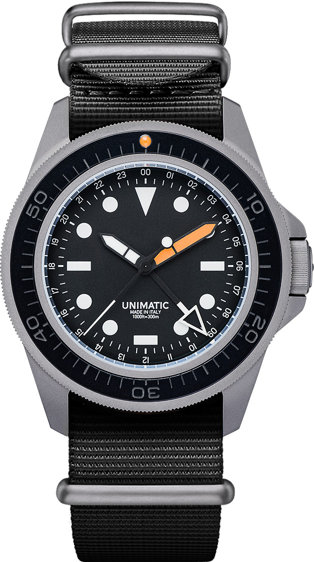 Discover the Modello Uno ref. U1S-T-GMT-ET, a titanium GMT dive watch by UNIMATIC and Exquisite Timepieces. This exclusive 150-piece edition features a robust 300m water resistance, dual lume for optimal readability, and a distinctive orange minute hand inspired by 70s dive watches. Powered by the Swiss ETA 2893-2 movement, it boasts a sand-blasted titanium case, black dial, and comes with both an orange TPU strap and a black NATO strap.