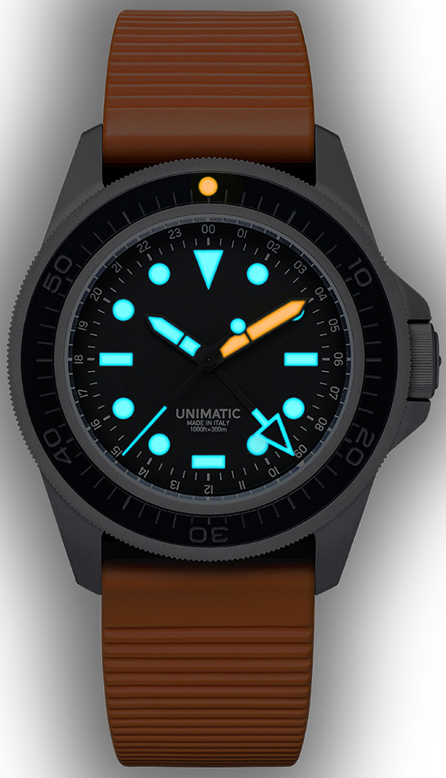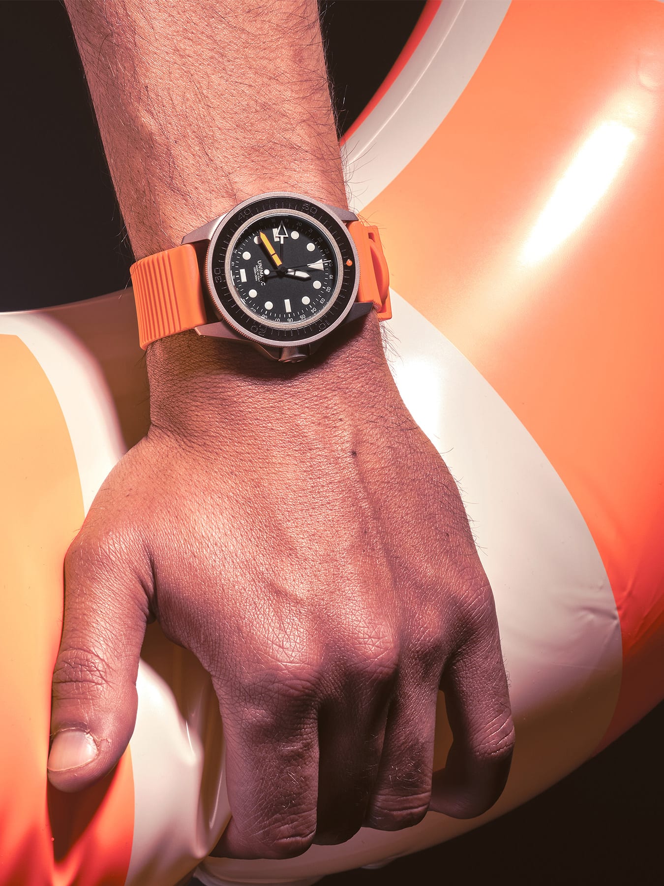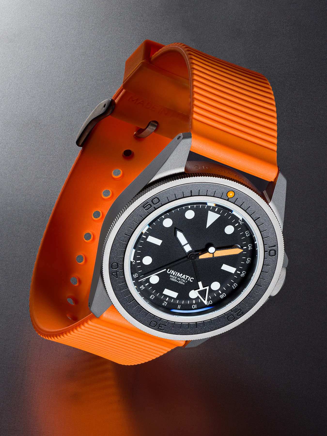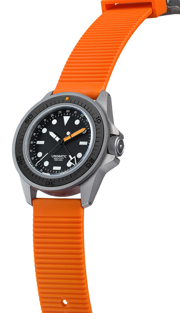 Discover the Modello Uno ref. U1S-T-GMT-ET, a titanium GMT dive watch by UNIMATIC and Exquisite Timepieces. This exclusive 150-piece edition features a robust 300m water resistance, dual lume for optimal readability, and a distinctive orange minute hand inspired by 70s dive watches. Powered by the Swiss ETA 2893-2 movement, it boasts a sand-blasted titanium case, black dial, and comes with both an orange TPU strap and a black NATO strap.