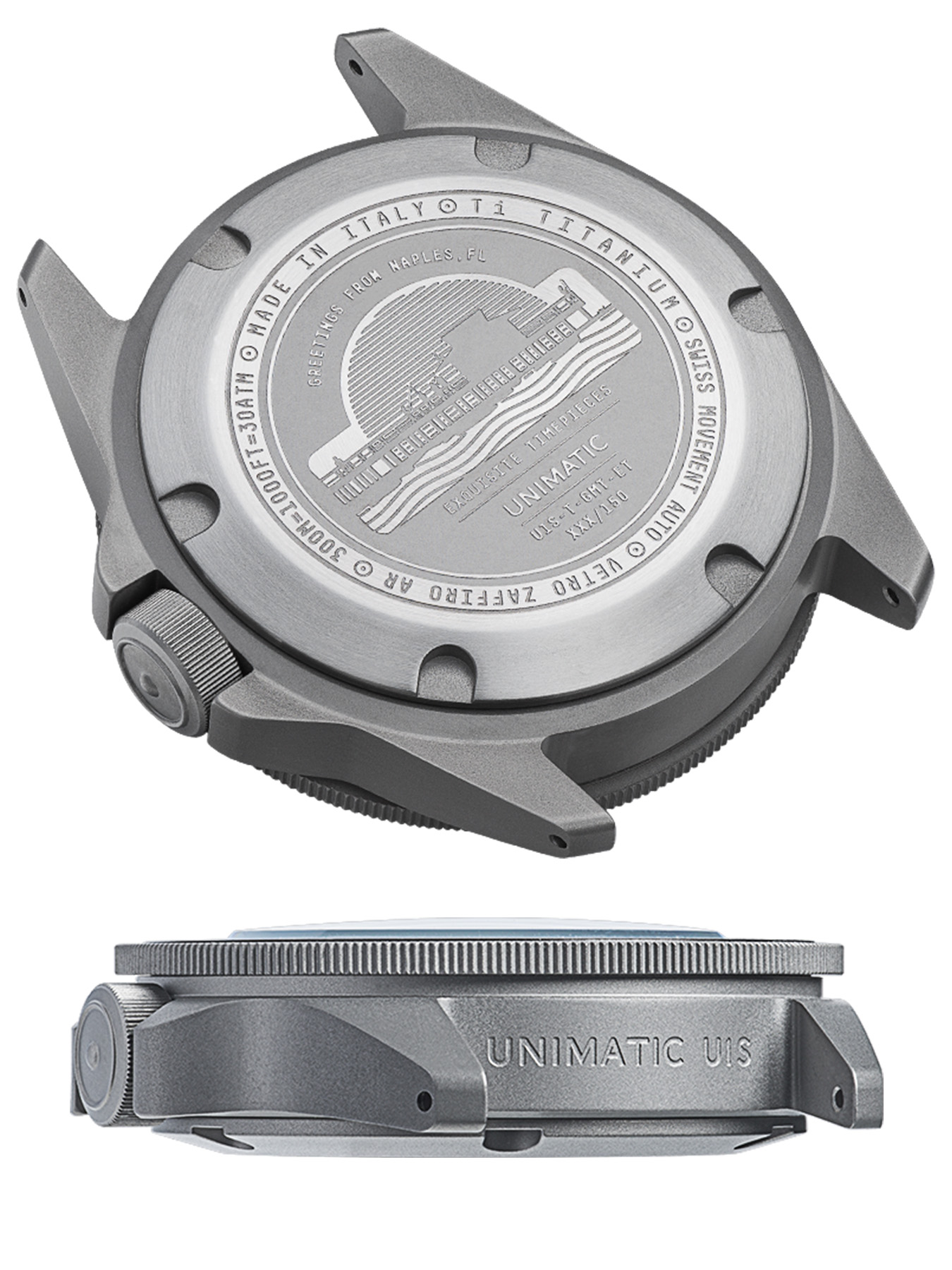 Sandblasted grade II titanium, 120 clicks mono-directional safety bezel, Matte black engraved aluminium professional diver insert with raised lume dot