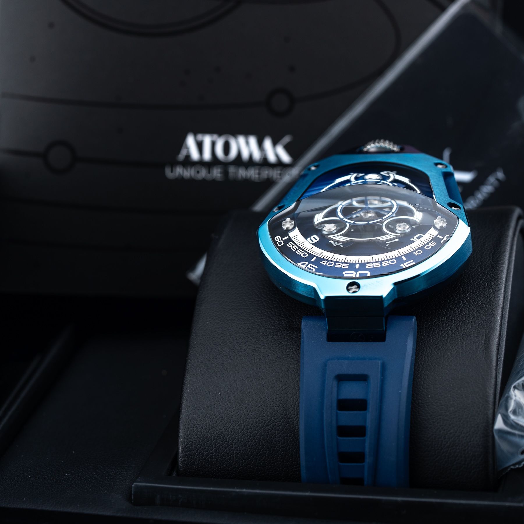 This Unworn Atowak Spaceship Abyssal Blue is in GREAT condition. This watch includes its Original Box, Original Papers and Warranty Card Not Dated, Extra Black Strap. This watch has been fully authenticated and certified by Exquisite Timepieces. Please note, the photos shown are of the actual watch you will receive.