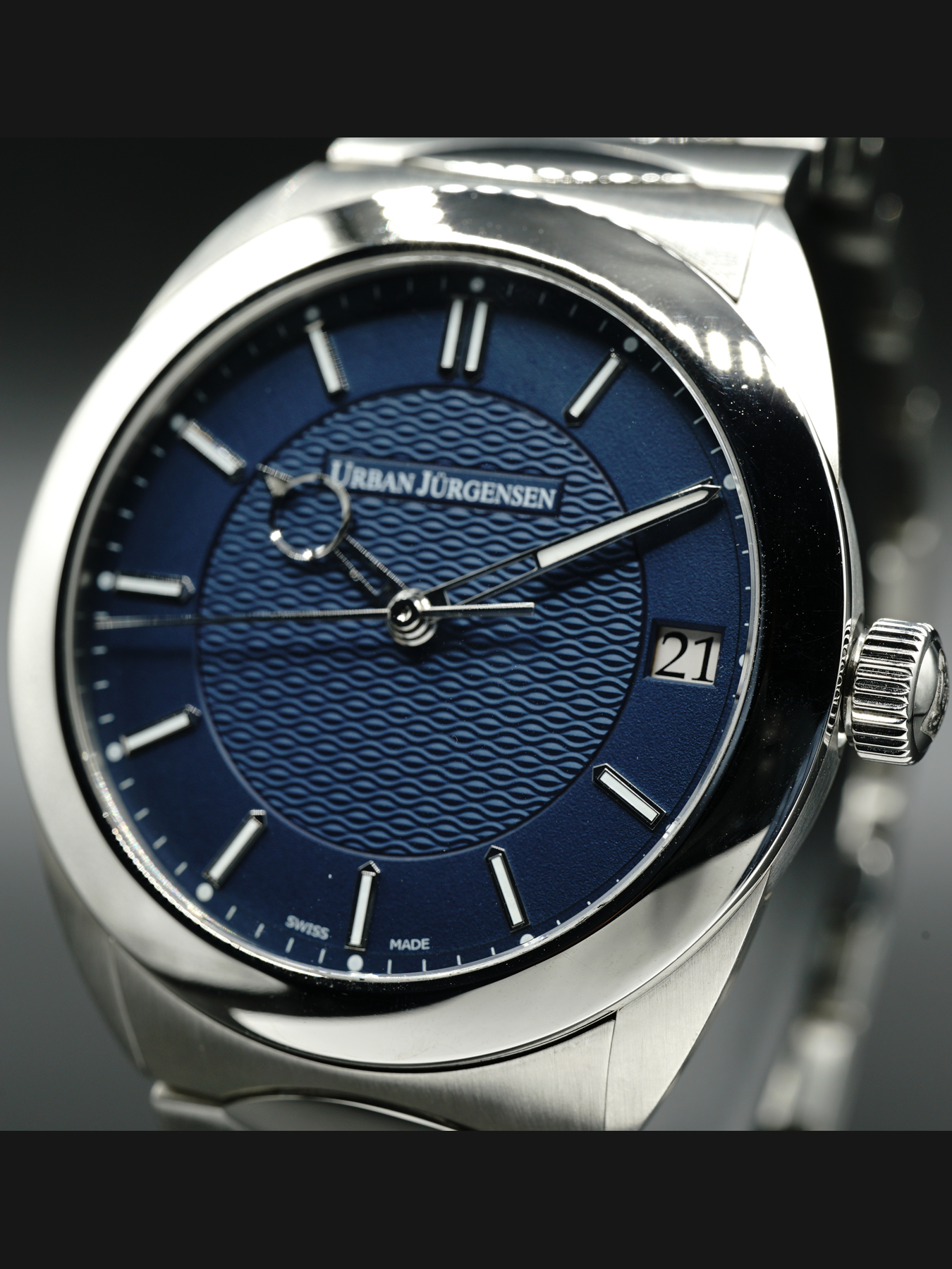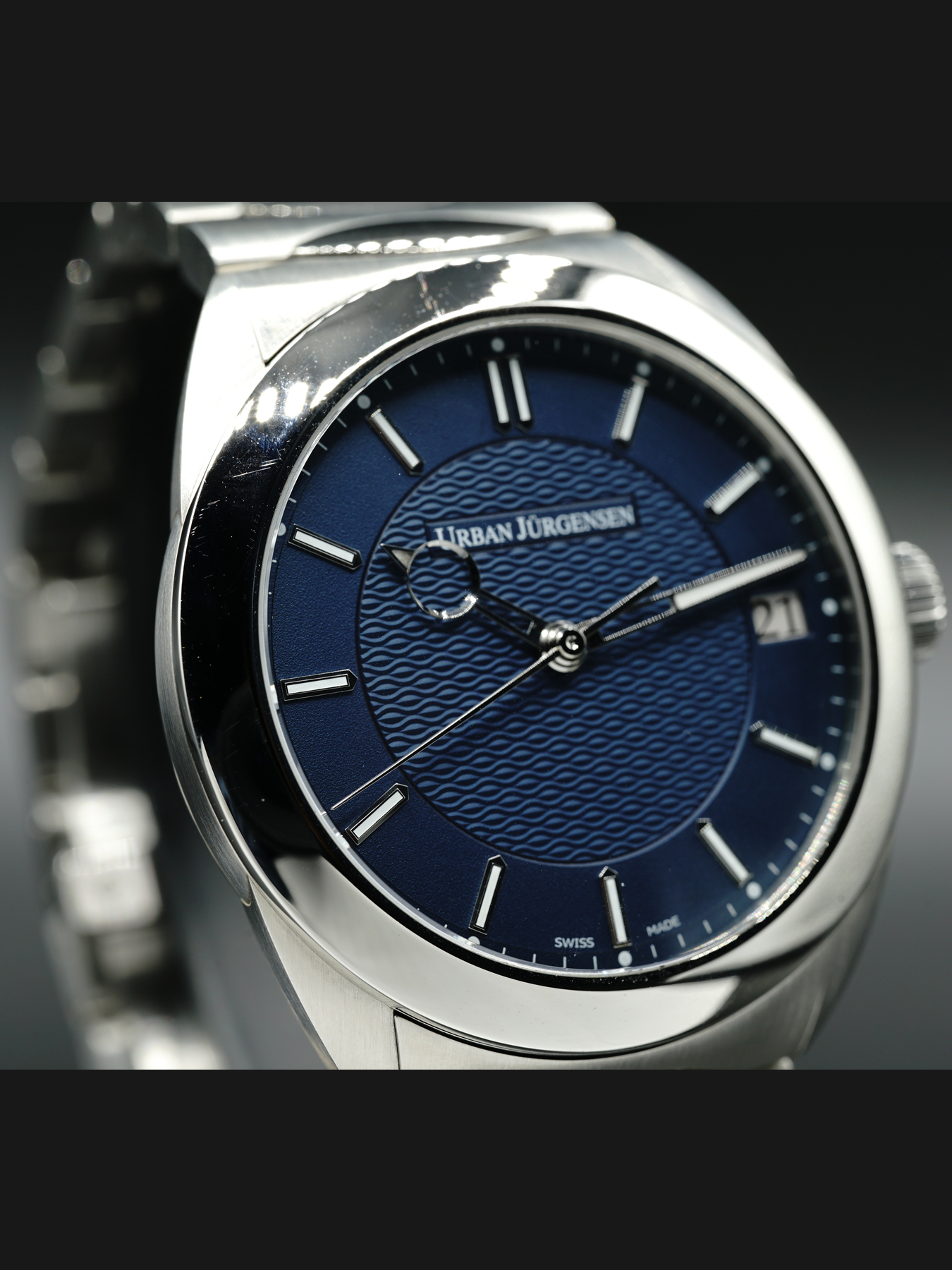 This is a stainless steel Urban Jürgensen One Collection 5241 and it is in GREAT condition. It has an integral tapered medical grade stainless steel link bracelet with satin brushed links and mirror polished oval duo shaped interlinks. This is a gorgeous piece and includes its original box.