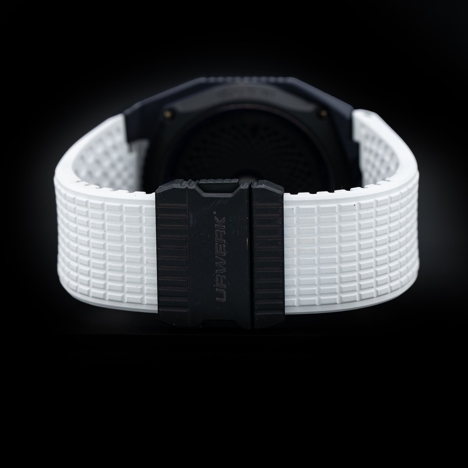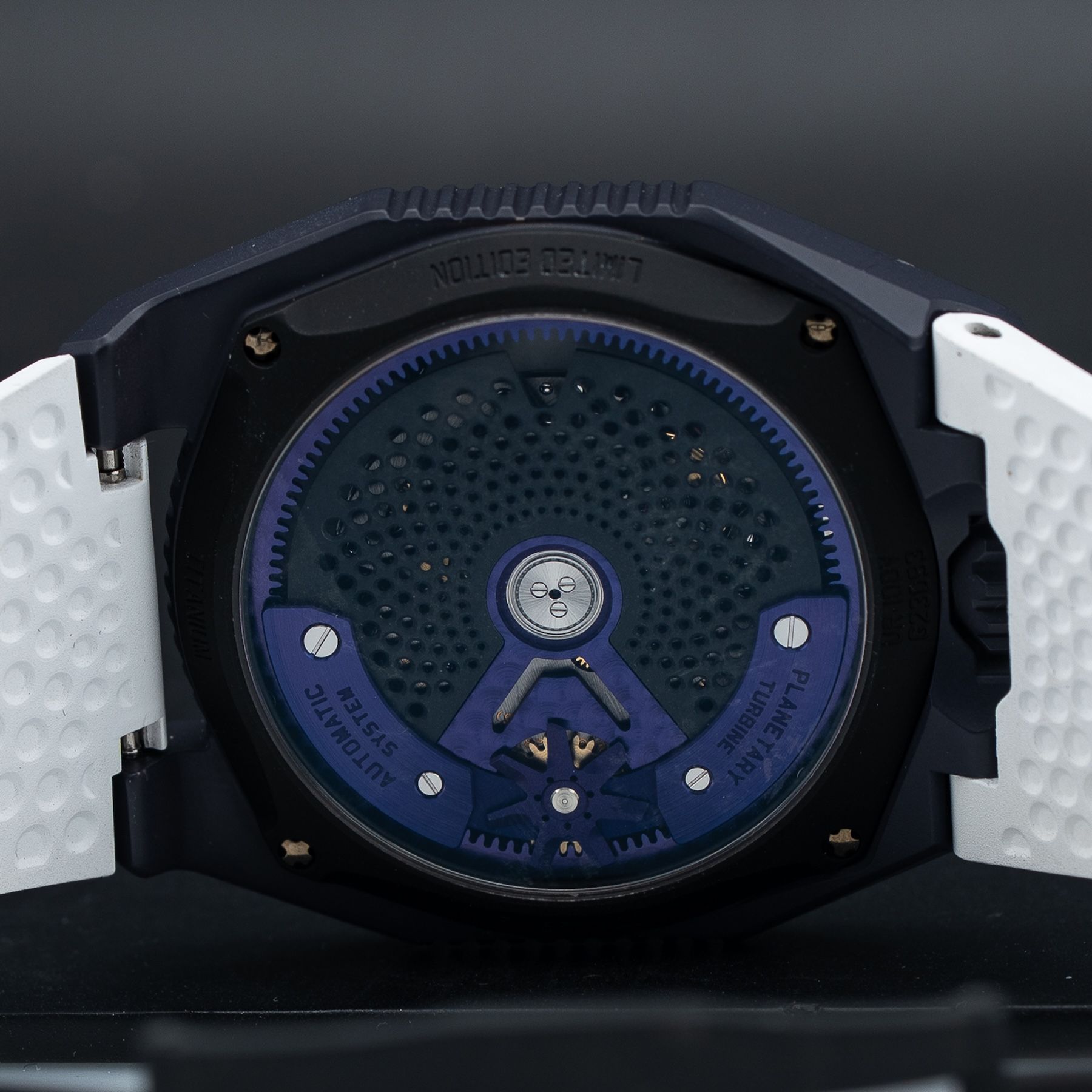 - This timepiece features a 41mm titanium case paired with a high quality rubber strap. It showcases a distinctive violet dial and is powered by a precise automatic winding movement. The watch is designed with a water resistance of up to 30m.