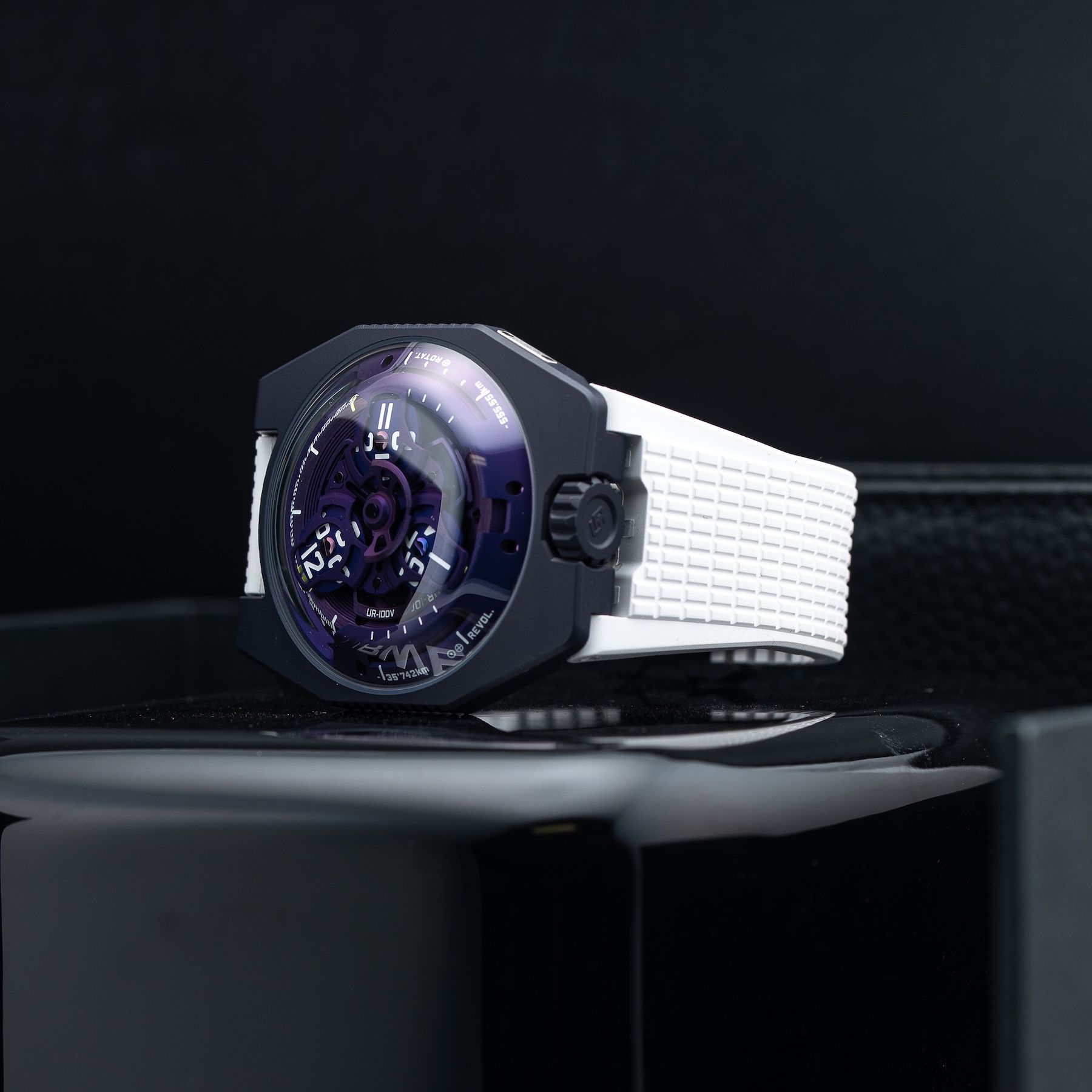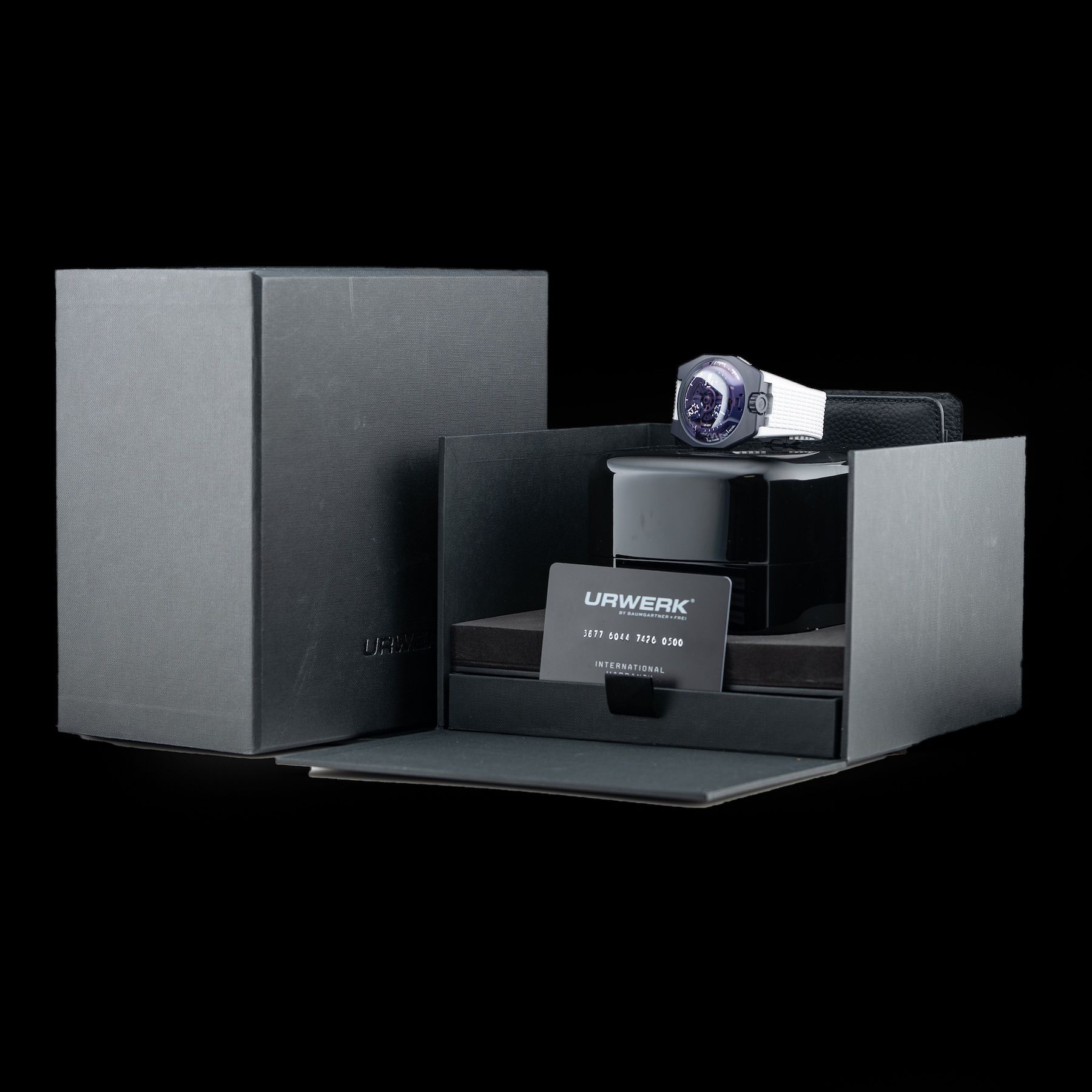 This Urwerk Ultraviolet UR-100V is in GREAT condition. This watch includes its original box, papers, and warranty card dated for 10/01/2023. This watch has been fully authenticated and certified by Exquisite Timepieces. Please note, the photos shown are of the actual watch you will receive.