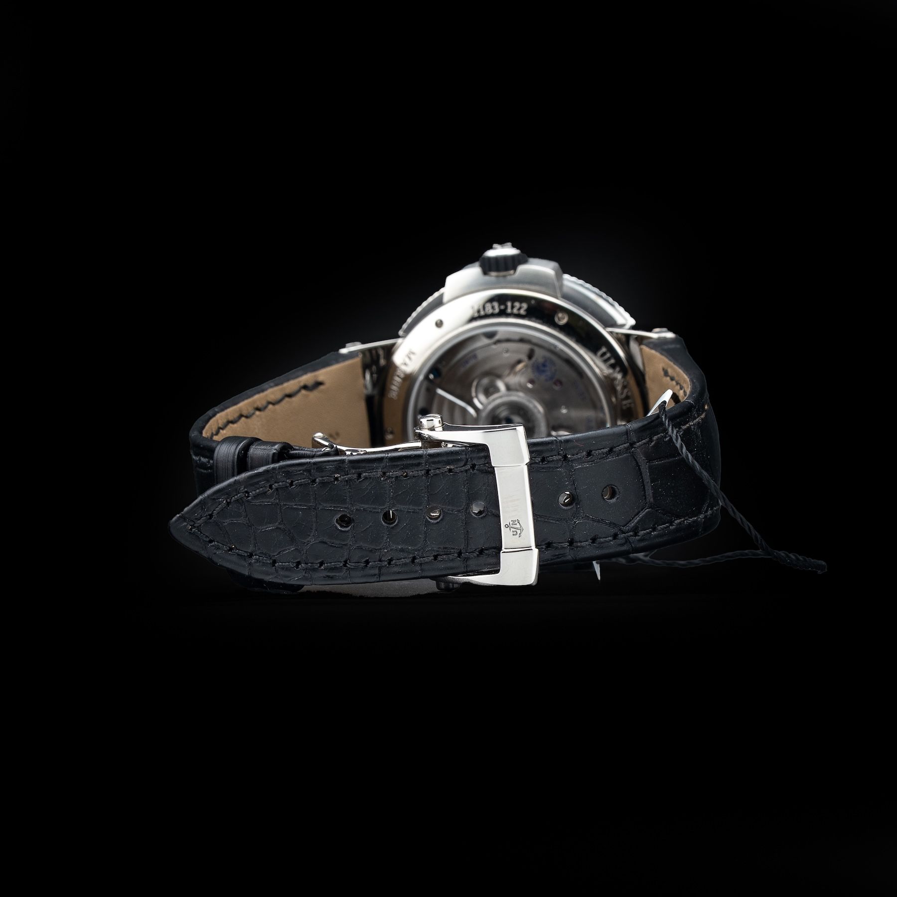 This watch features a 45mm stainless steel & titanium case on leather strap. This watch also sports a black dial. Powered by a self-winding automatic movement. Water resistance up to 200 meters.