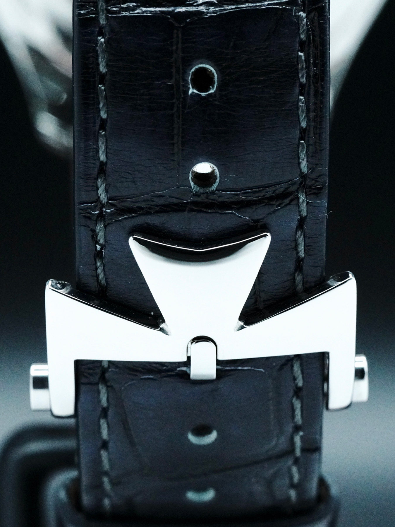 This watch features a 40mm stainless steel case on leather strap. This watch also sports a double finished grey-toned dial. Powered by a self-winding movement. Water resistance up to 30 meters.