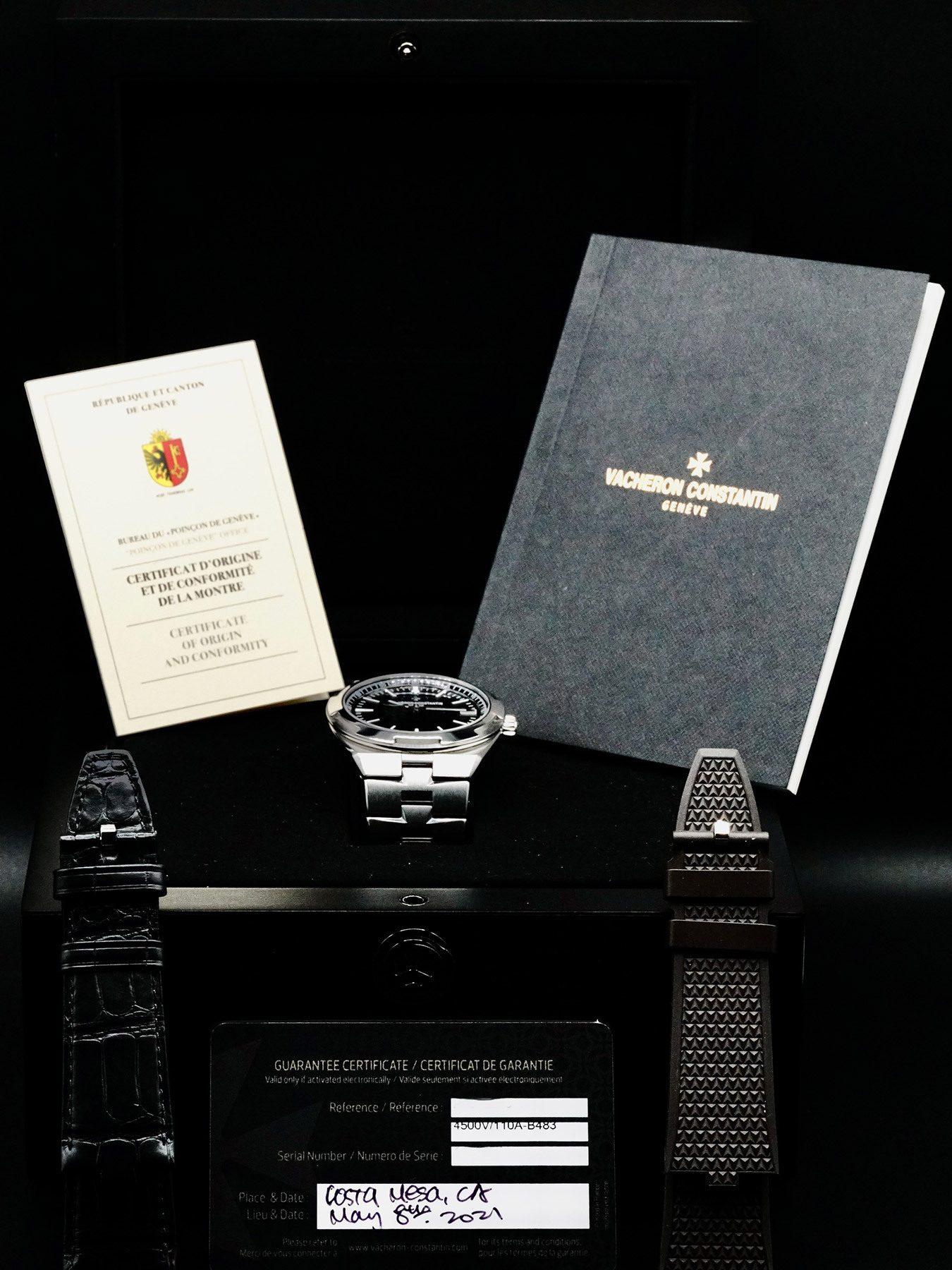 This Vacheron Constantin Overseas 4500V/11OA-B483 is in EXCELLENT condition. This watch includes its original box, instruction booklet and warranty dated for 2021. Extra brown rubber strap, black leather strap, and grey rubber strap with a stainless steel buckle.