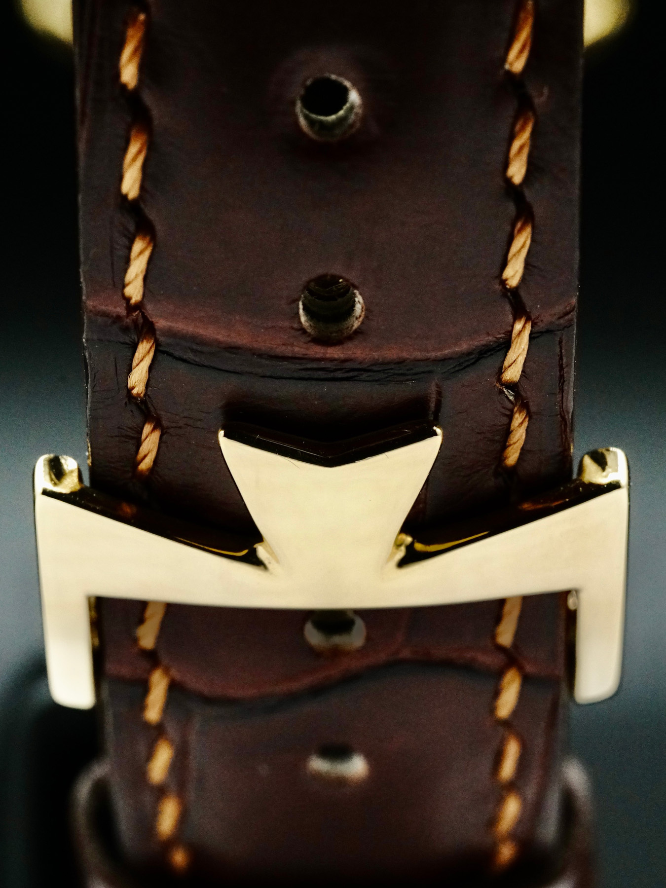 This watch features a 39mm 18k yellow gold with white dial. Powered by a Mechanical Automatic Movement. Water resistance up to 30 meters.