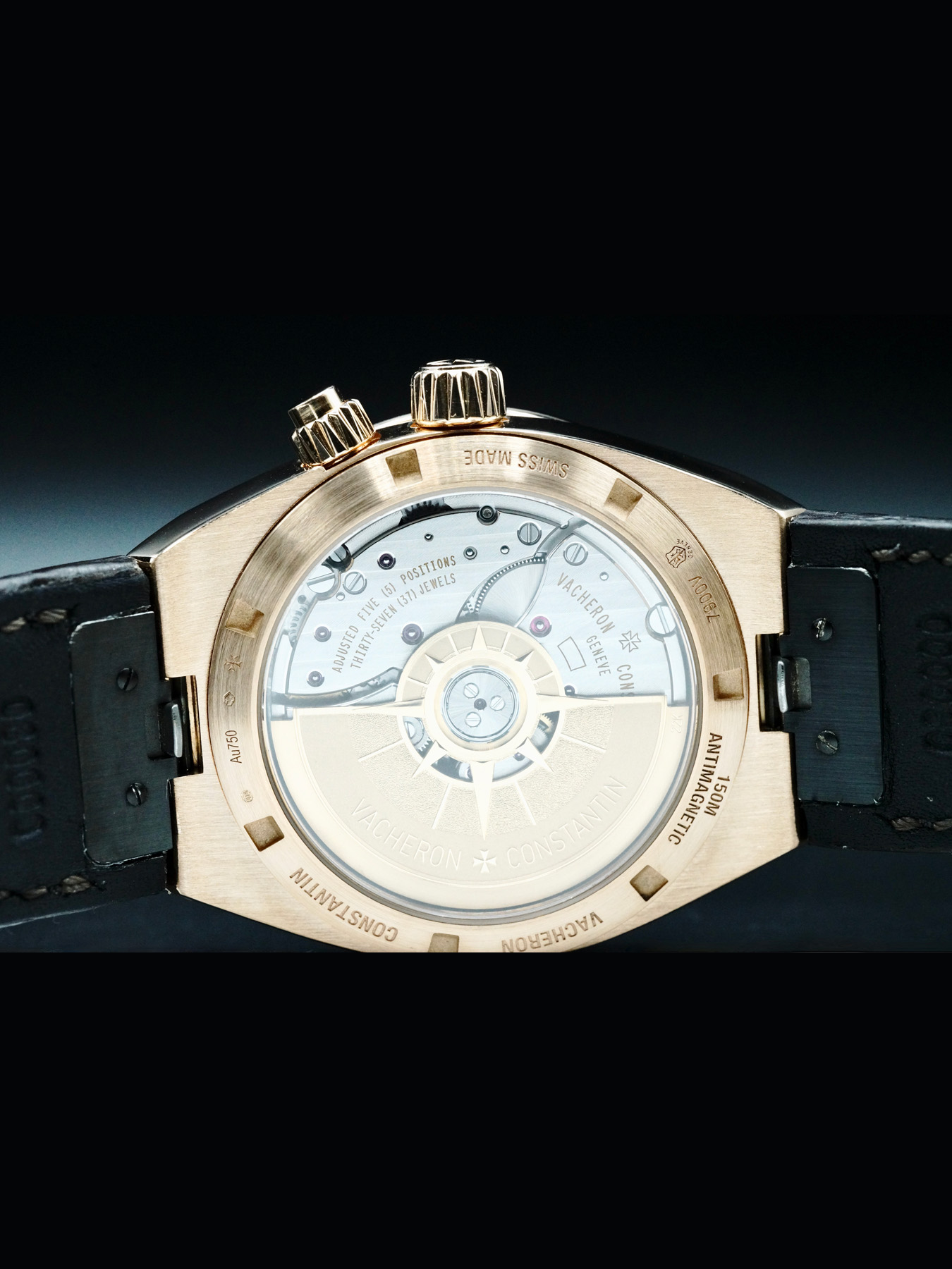 This Vacheron Constantin Overseas Dual Time features a 41mm 18k rose gold case with an exhibition case back on a brown leather strap. This watch also sports a silver dial with luminous hands and index dial markers covered by scratch resistant sapphire crystal.
