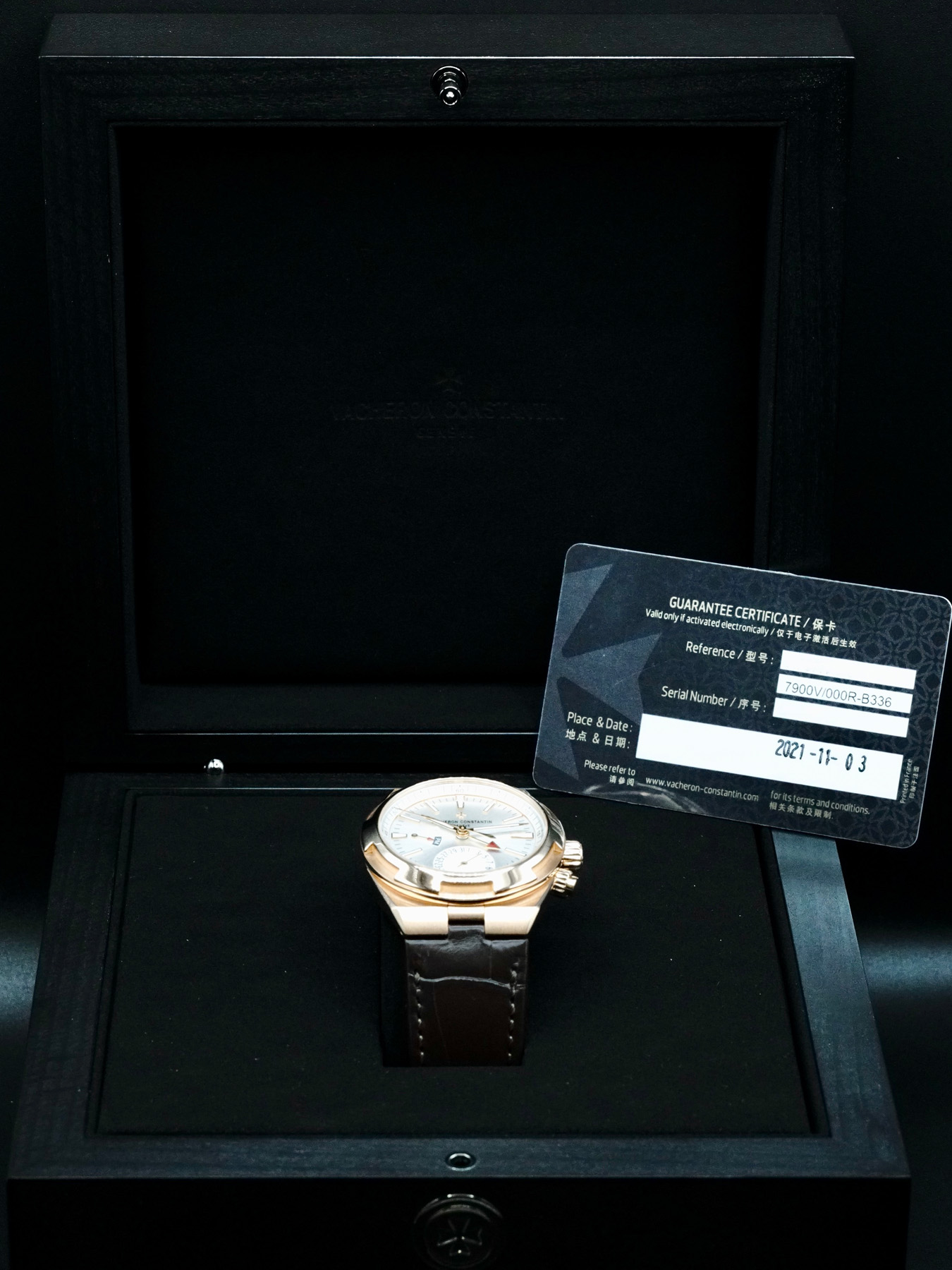 This Vacheron Constantin Overseas Dual Time 7900V/000R-B336 is in EXCELLENT condition. This watch includes its original box and warranty card dated for 2021. This watch has been fully authenticated and certified by Exquisite Timepieces.