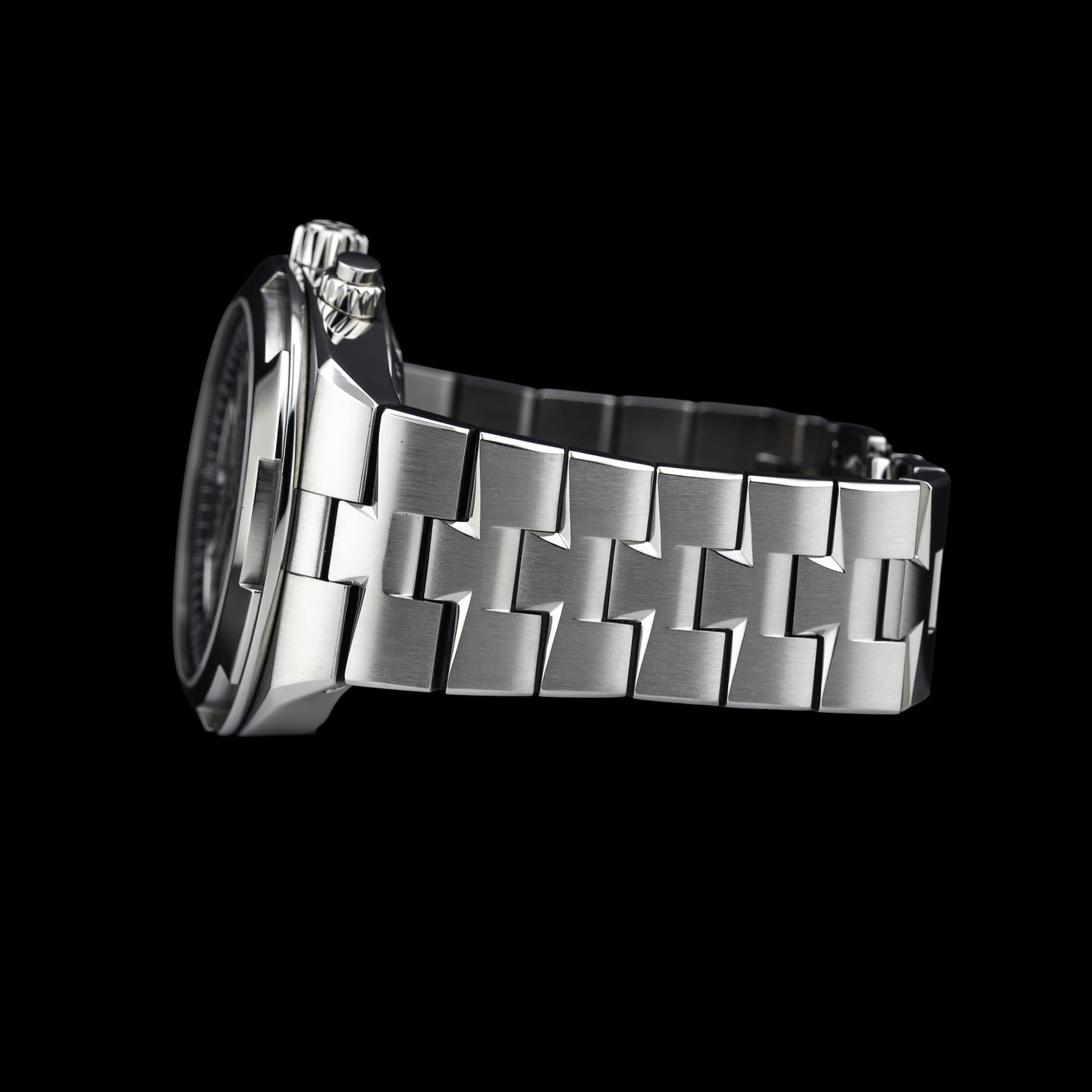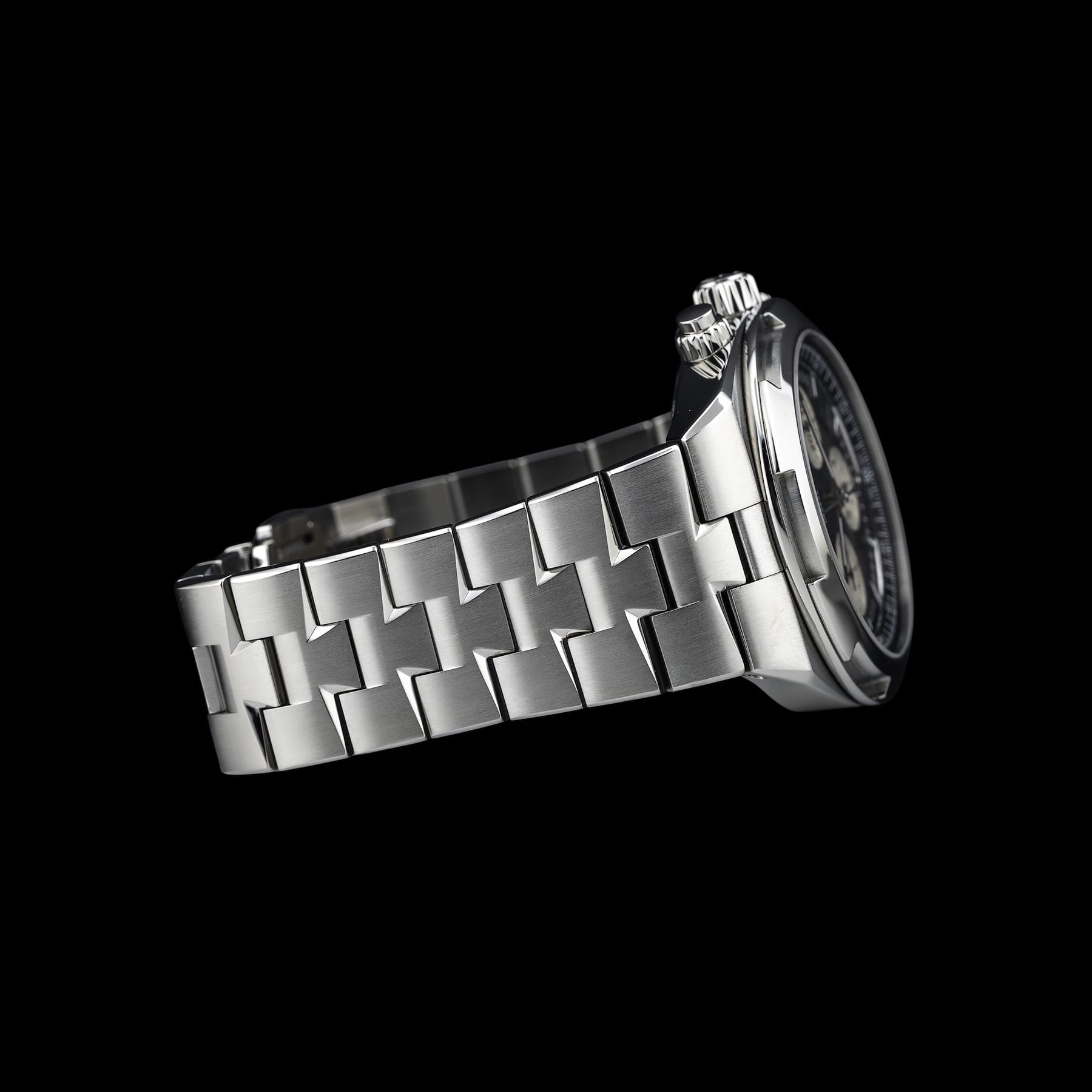 This watch features a 42.5mm steel case on steel bracelet. This watch also sports a black dial. Powered by an automatic movement. Water resistance up to 150 meters.