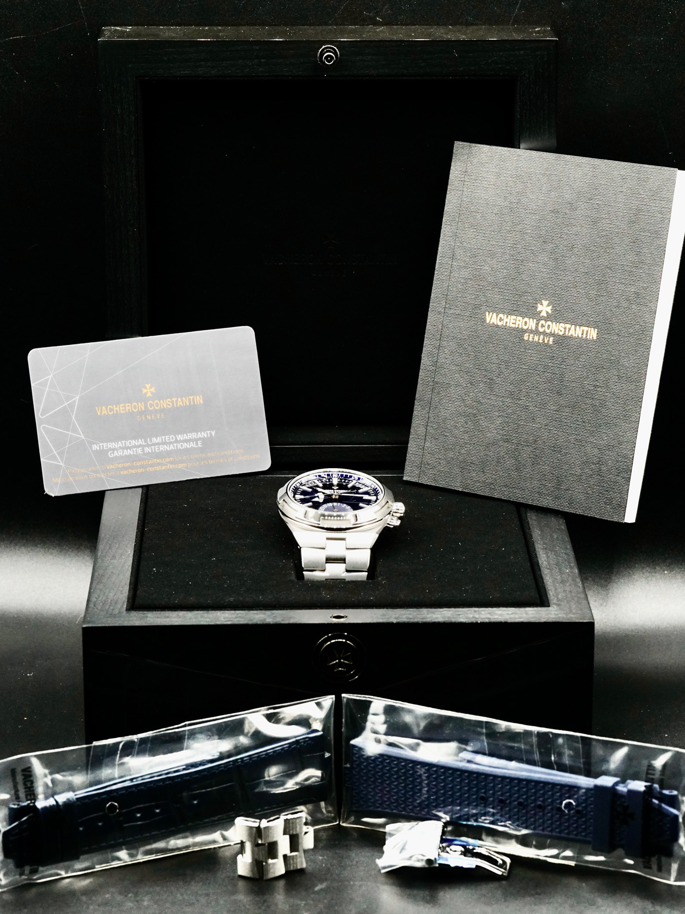This Vacheron Constantin X79A1573 GMT is in EXCELLENT condition. It has box and papers. International limited warranty dated for August 2022. Extra blue leather & blue rubber straps. Extra stainless steel bracelet links & buckle.