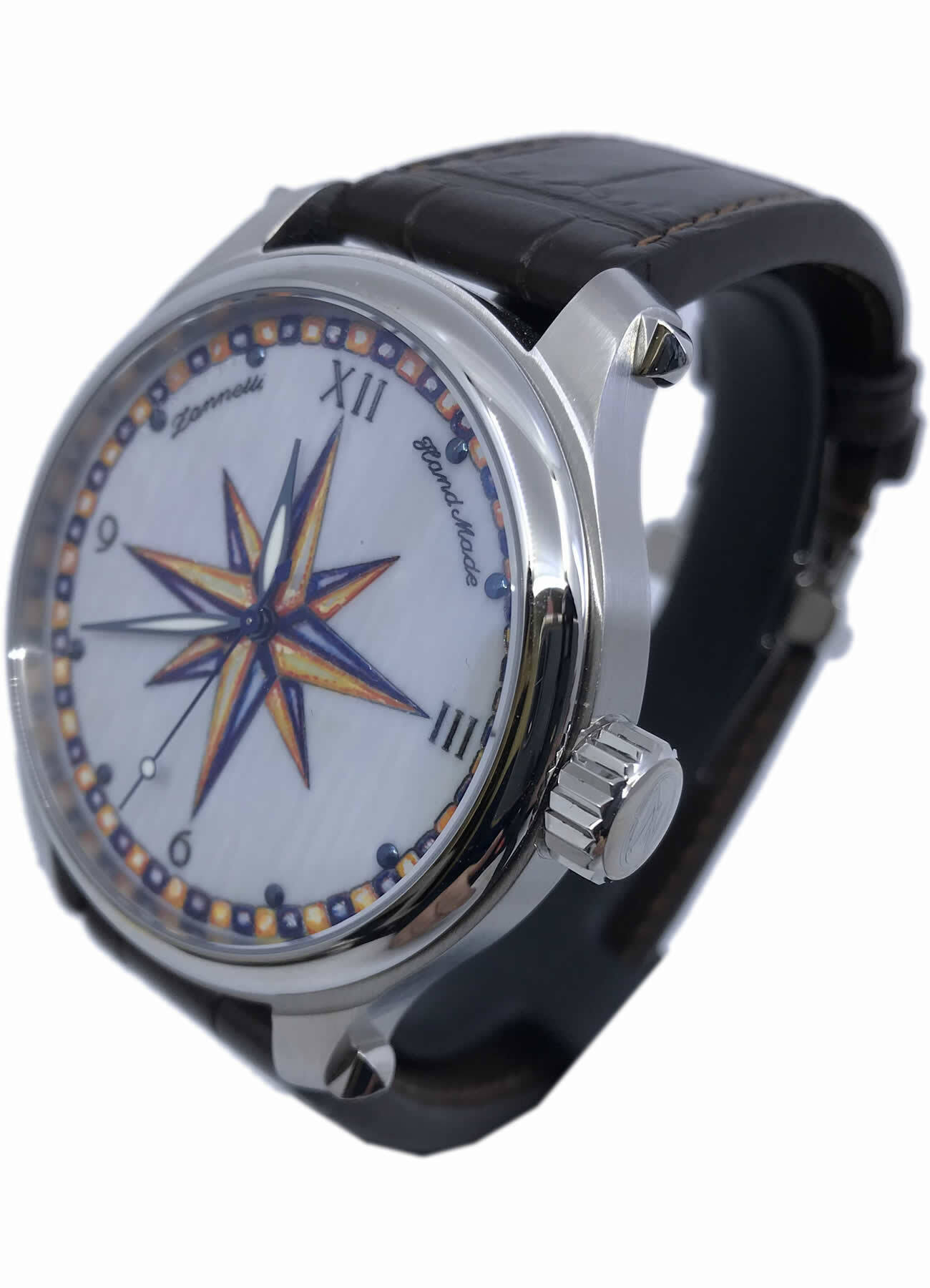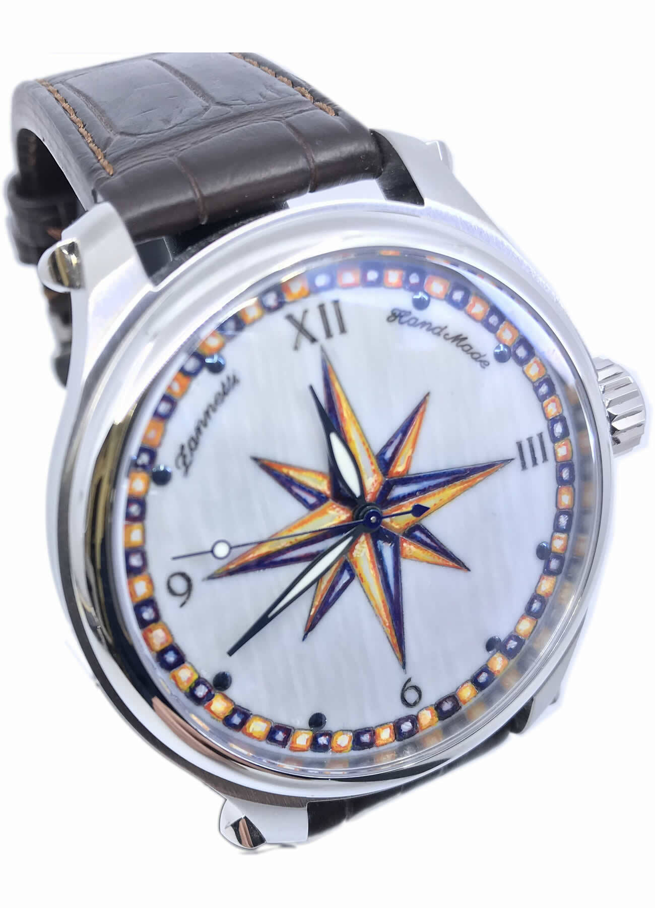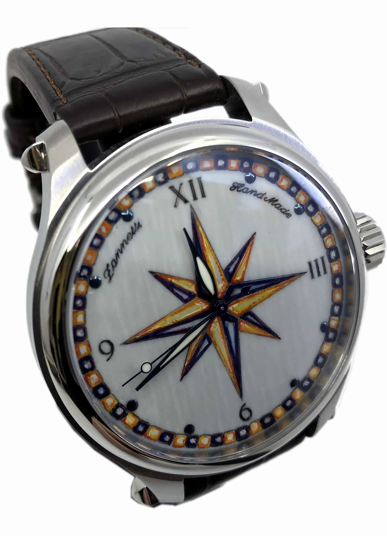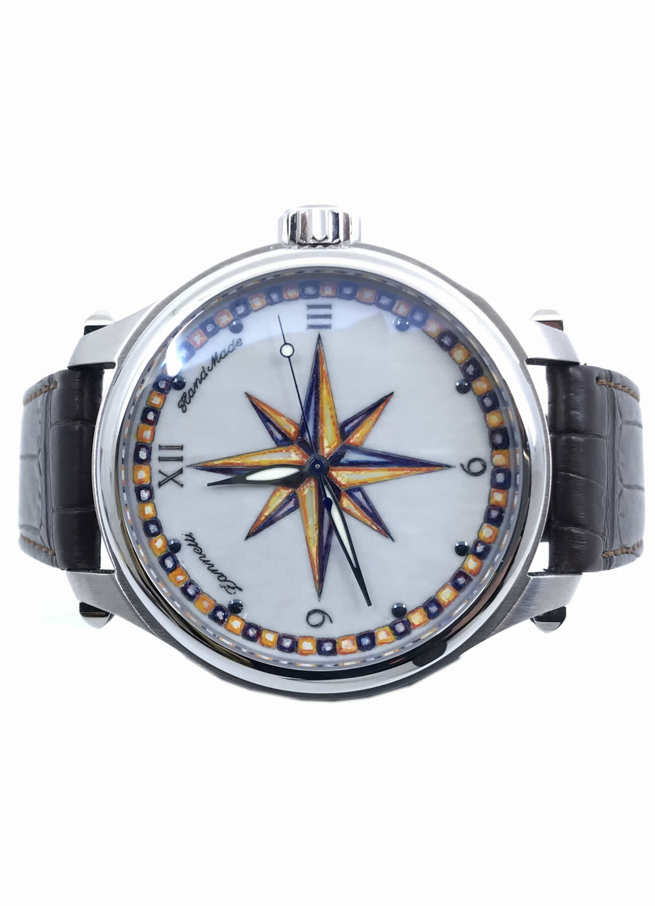 - This timepiece features a 47mm steel case paired with a high quality leather strap. It showcases a distinctive multicolor dial and is powered by a precise automatic winding movement. The watch is designed with a water resistance of up to 50m.