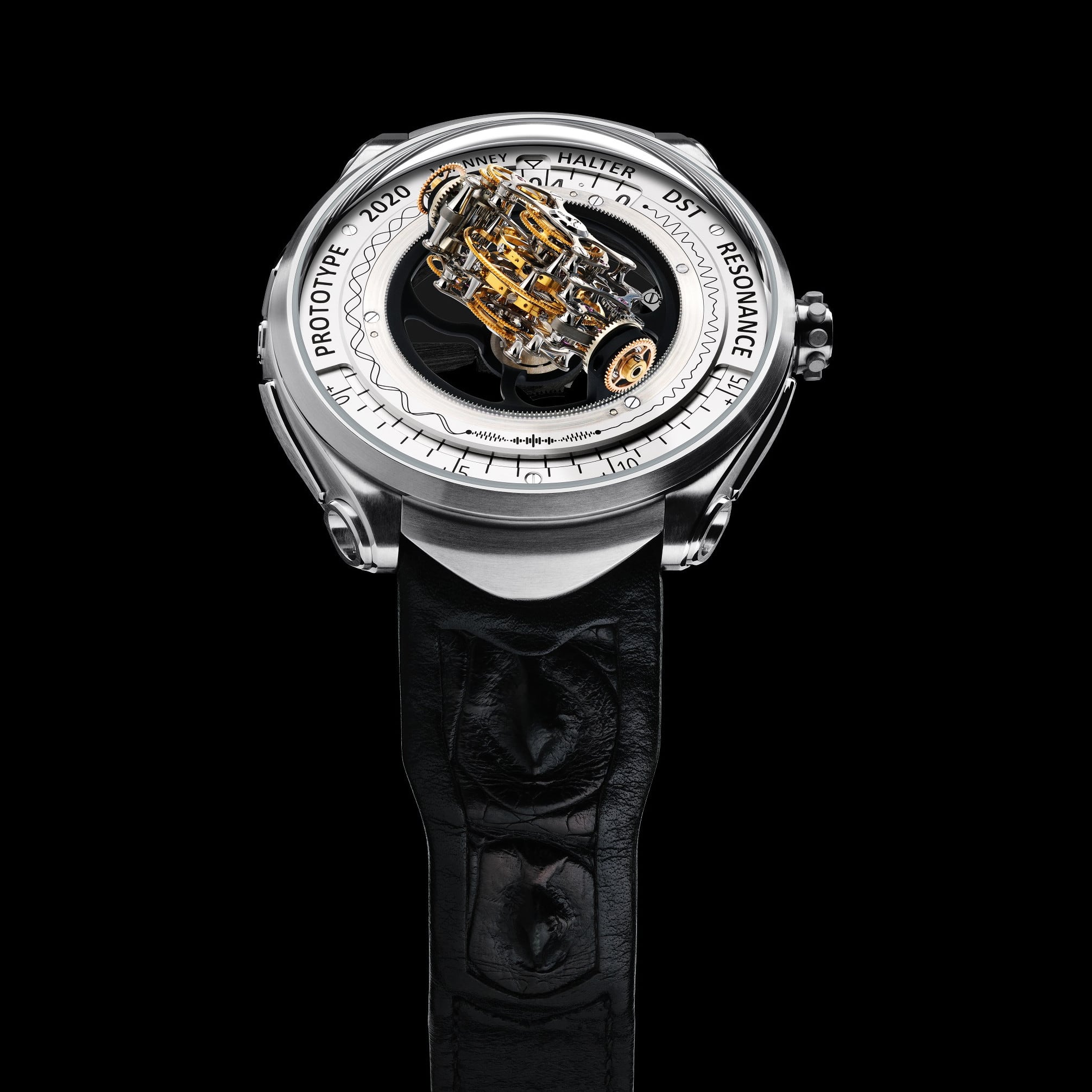 The Deep Space Resonance Prototype is a manually wound, 65h power reserve watch. The balances start to resonate as soon as the energy is sufficient to set the balances in motion, and stay synchronized until all motion stops. The balances will synchronize and oscillate at the same time, but not necessarily in the same direction at the same time. This will define the resonance mode. The mode depends on the position the balances were occupying when they started beating, and will keep this mode until the end of the power reserve. The next time the watch is wound, the balances may start beating in a different mode, and will offer a new view to the resonance phenomenon.