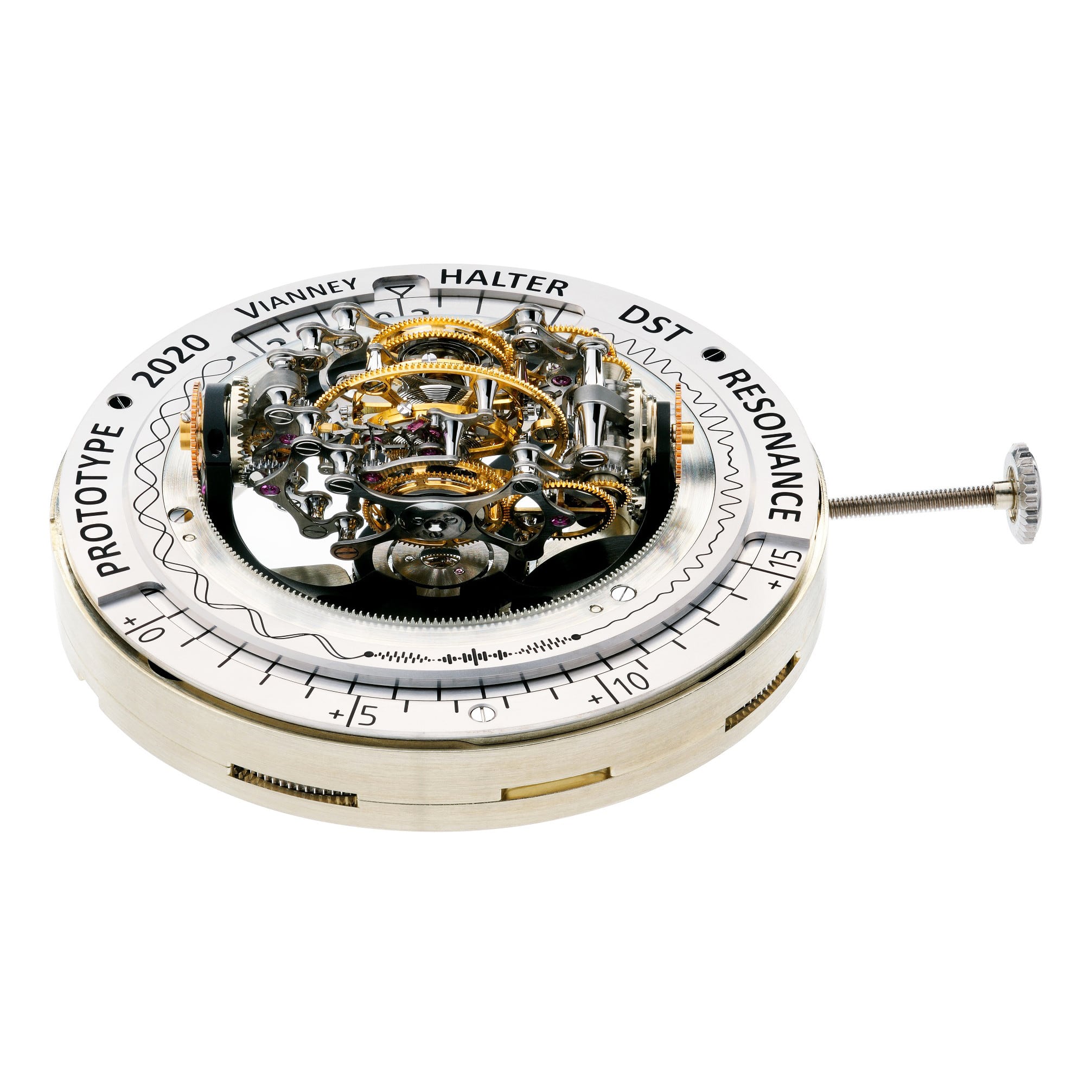 The Vianney Halter Deep Space Resonance (DSR) Prototype is a unique, sci-fi-inspired haute horlogerie watch featuring a 46mm titanium case, an in-house manual-wind movement (VH 113), a 3-axis tourbillon with two resonating balance wheels (21,600 vph), 65-hour power reserve, and a complex Vernier caliper-style time display, all designed to test acoustic synchronization, with production versions offering better legibility and delivery starting in 2021