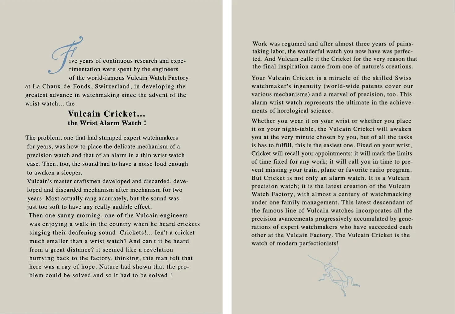 The year 1947 marked a pivotal moment for Vulcain with the launch of the world's first alarm wristwatch featuring a striking mechanism: the Cricket. The sound would become a Vulcain signature. It was not just audible – it was powerful enough to reliably wake its wearer (to the sound of a very vigorous and determined cricket). A world first, the Vulcain Cricket soon became very fashionable, earning the moniker "The Presidents' Watch" as President Harry S. Truman and his successors— Eisenhower, Nixon, and Johnson—also found it quite useful.