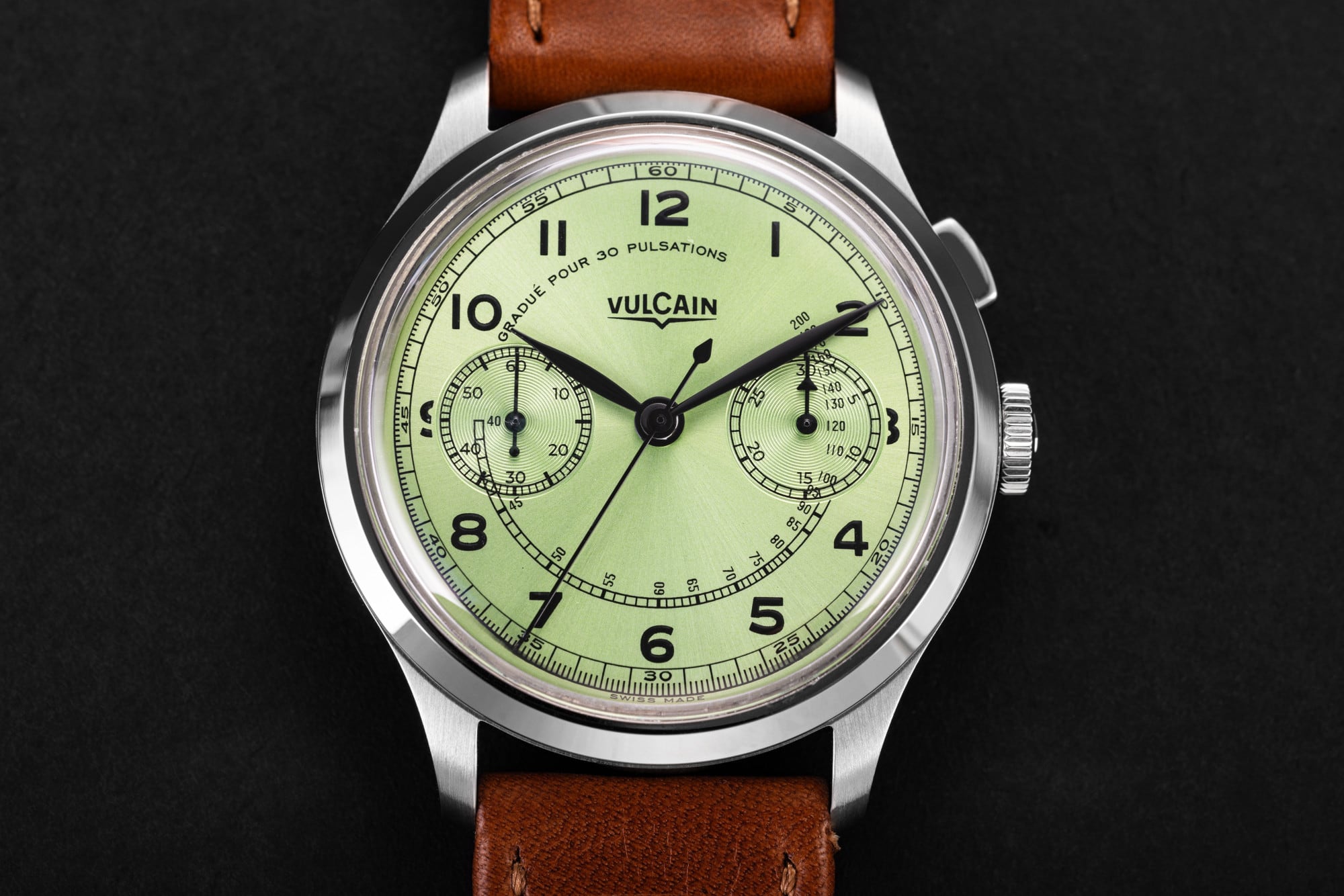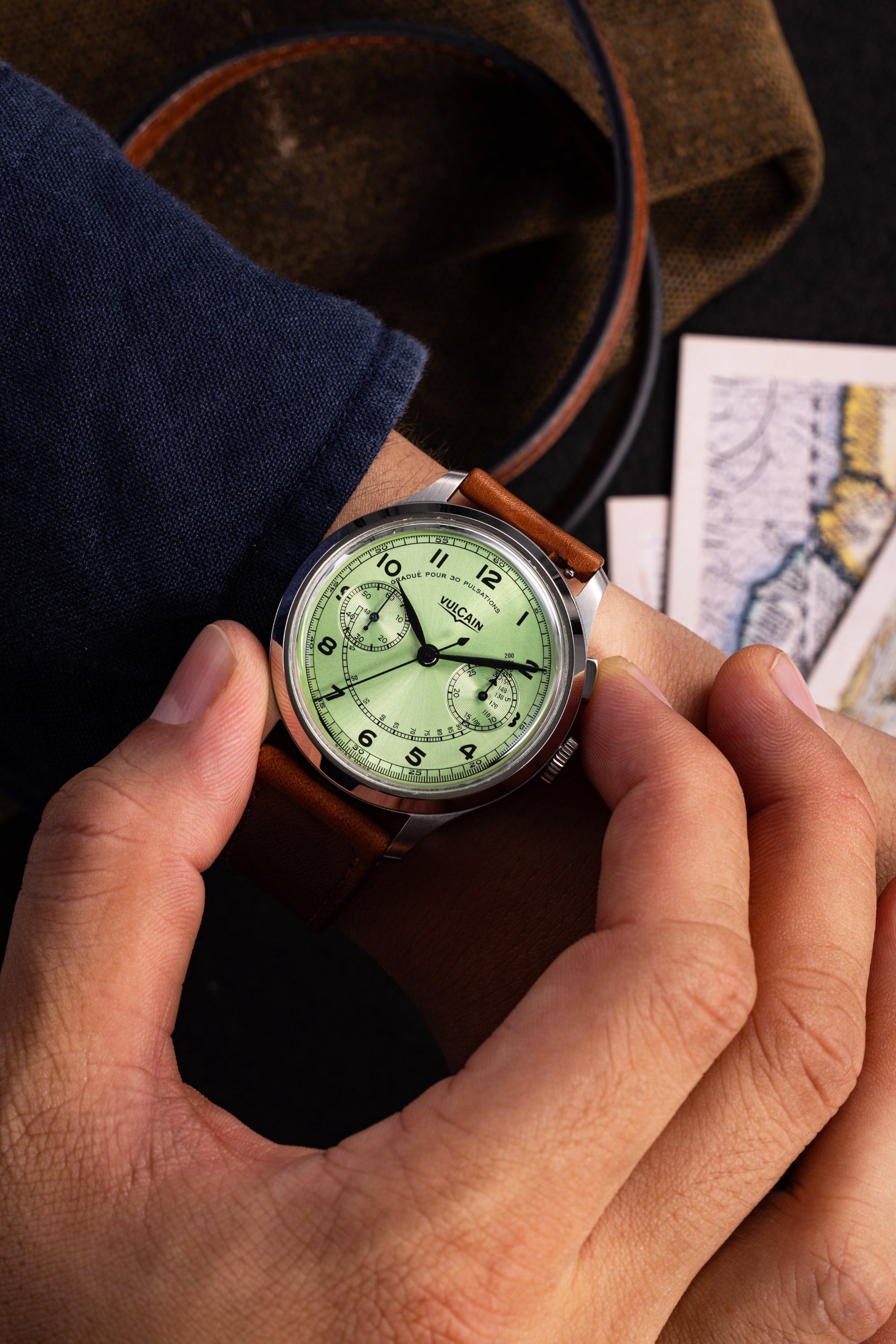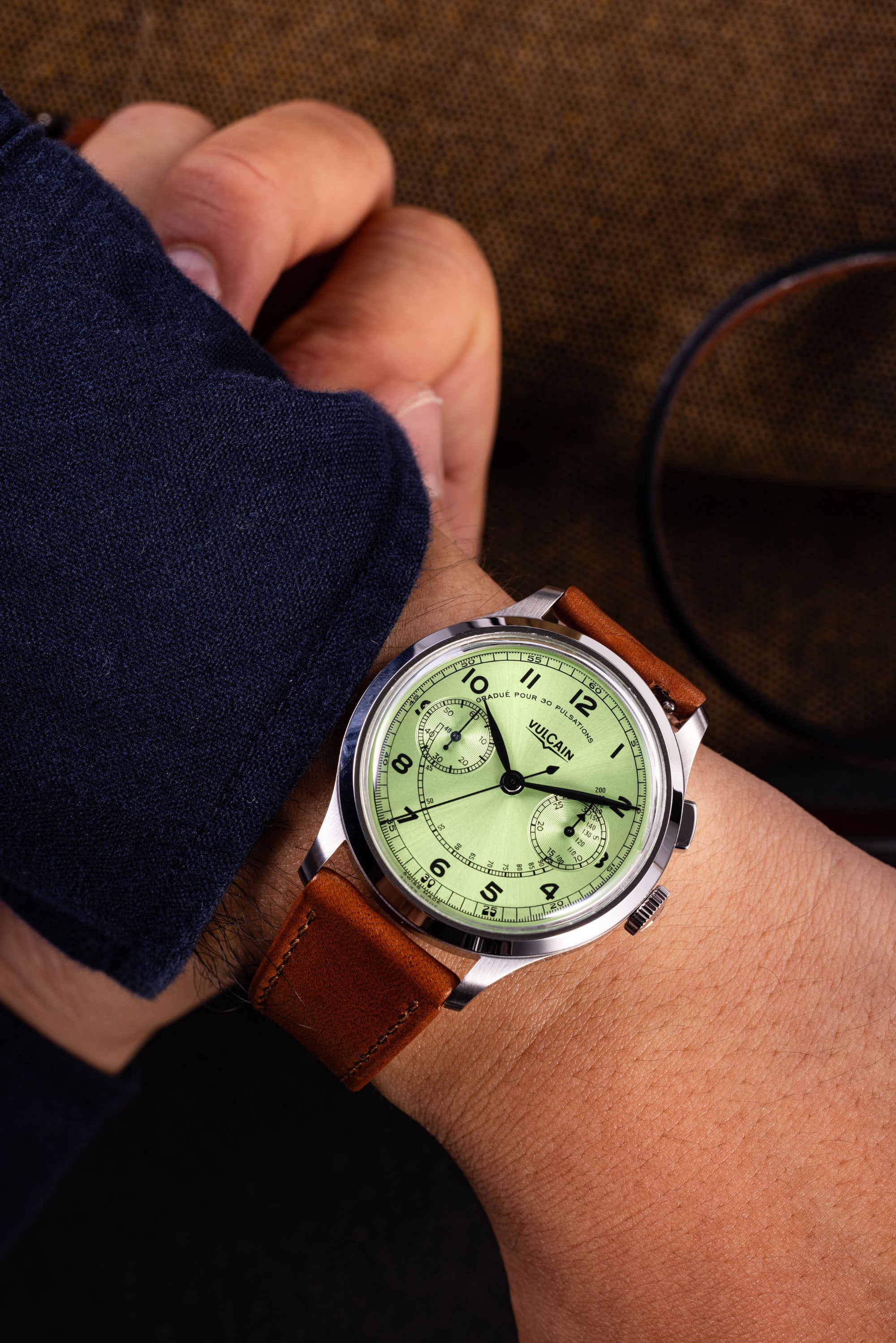 The Vulcain Manufacture pays tribute to its legacy with the re-issue of the Monopusher Green, a captivating version of the legendary 1950s Chronograph Heritage. Featuring a refined 39mm case, this model stays true to Vulcain's celebrated designs from the past while offering modern watchmaking excellence.