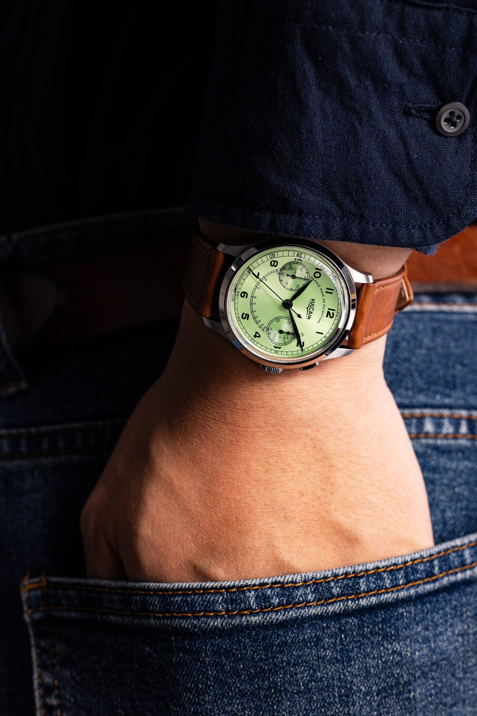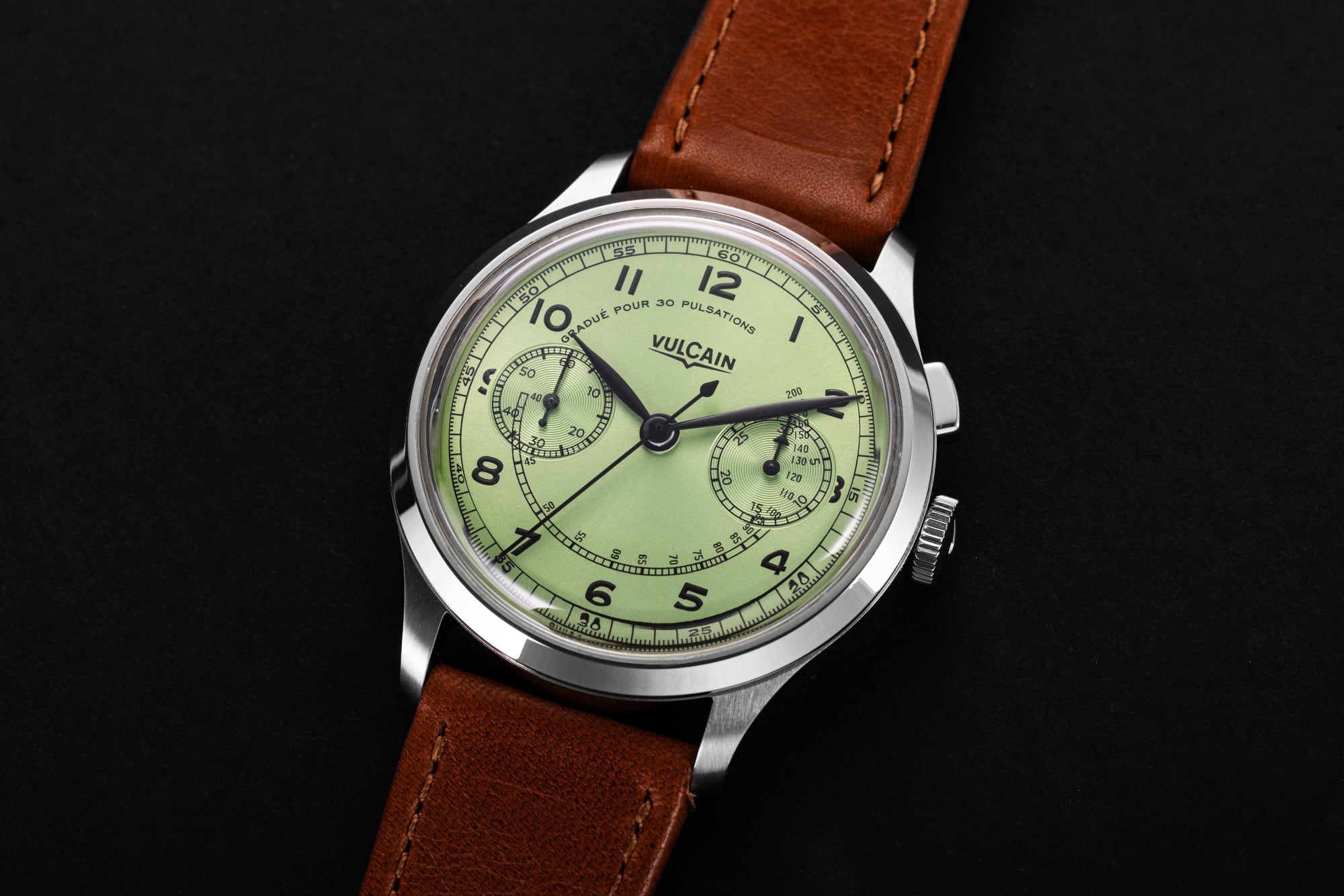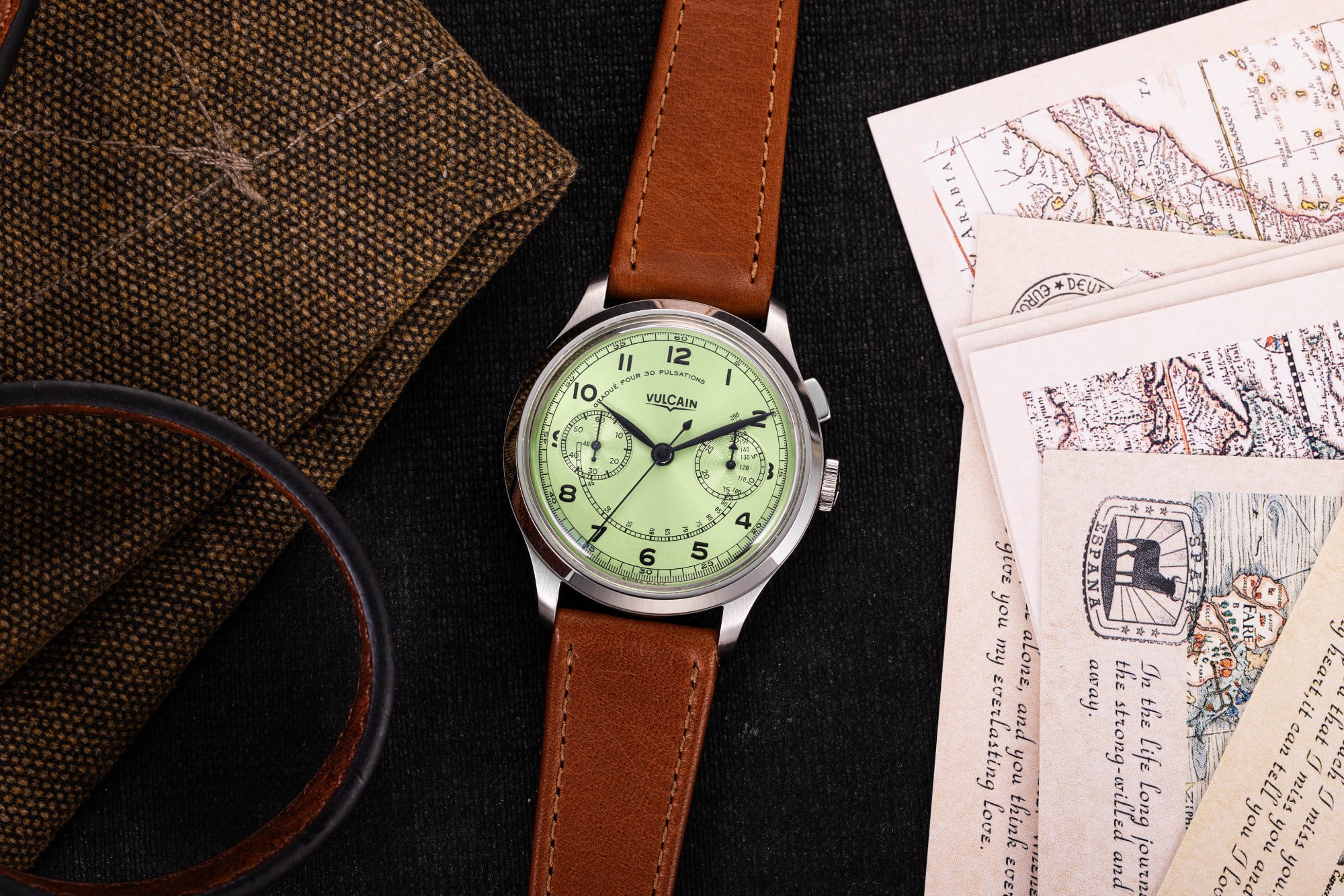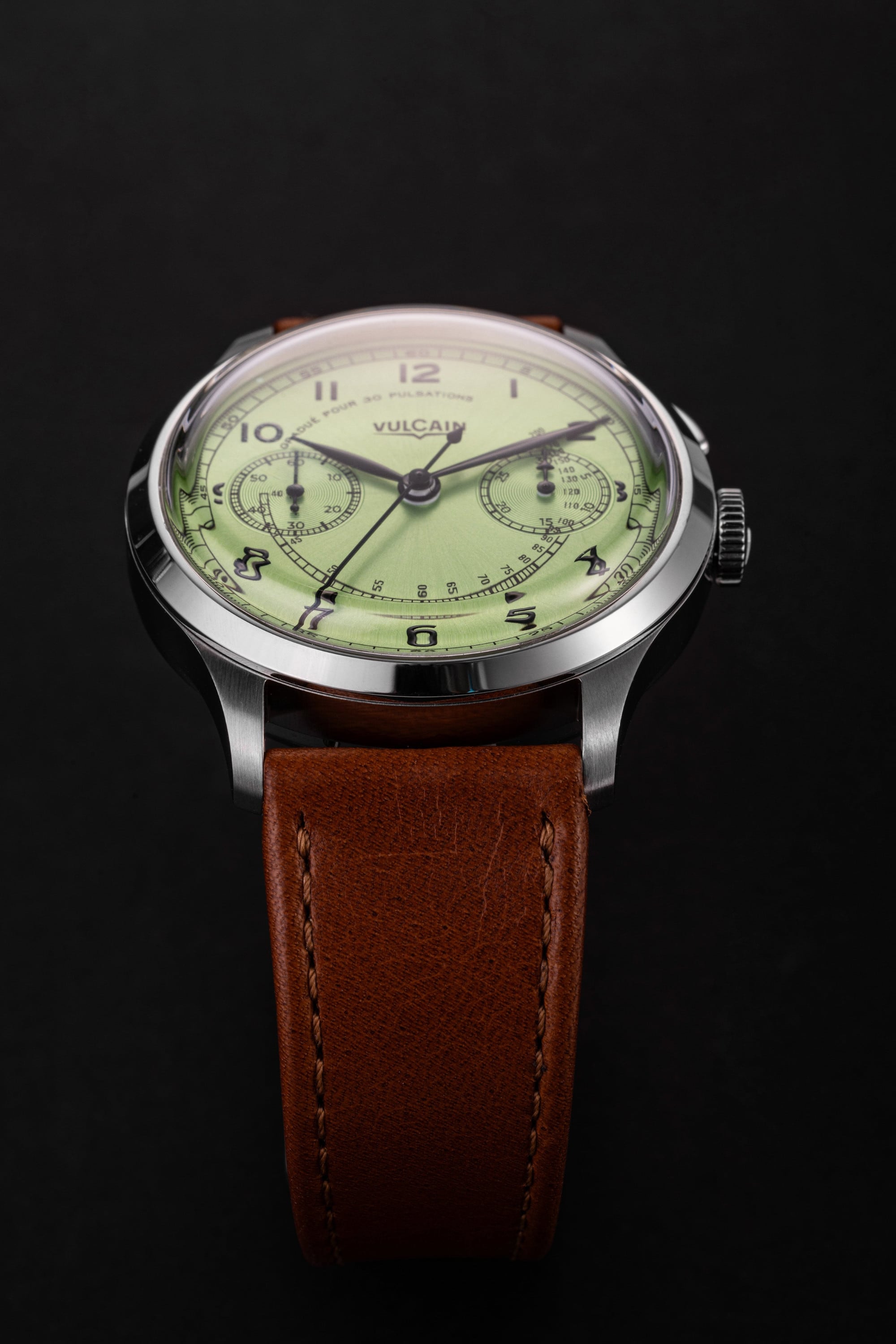 The Vulcain Manufacture pays tribute to its legacy with the re-issue of the Monopusher Green, a captivating version of the legendary 1950s Chronograph Heritage. Featuring a refined 39mm case, this model stays true to Vulcain's celebrated designs from the past while offering modern watchmaking excellence.