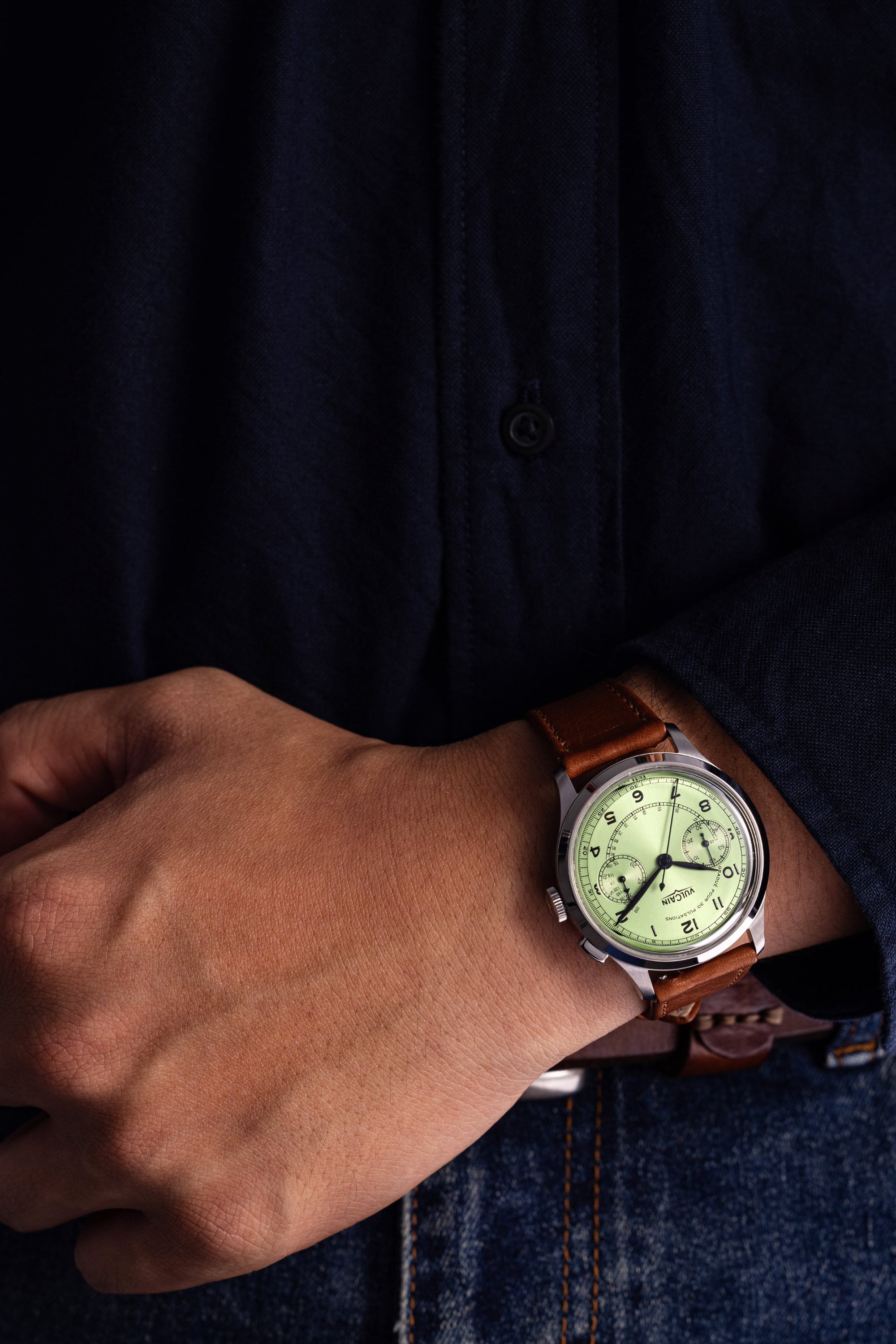 The sunburst green dial boasts the same polished silver numerals and hour-markers that adorned the original. Alongside the minute track, the dial also features a pulsometer scale marked "Graduated for 30 pulsations", staying faithful to the historical aesthetic.