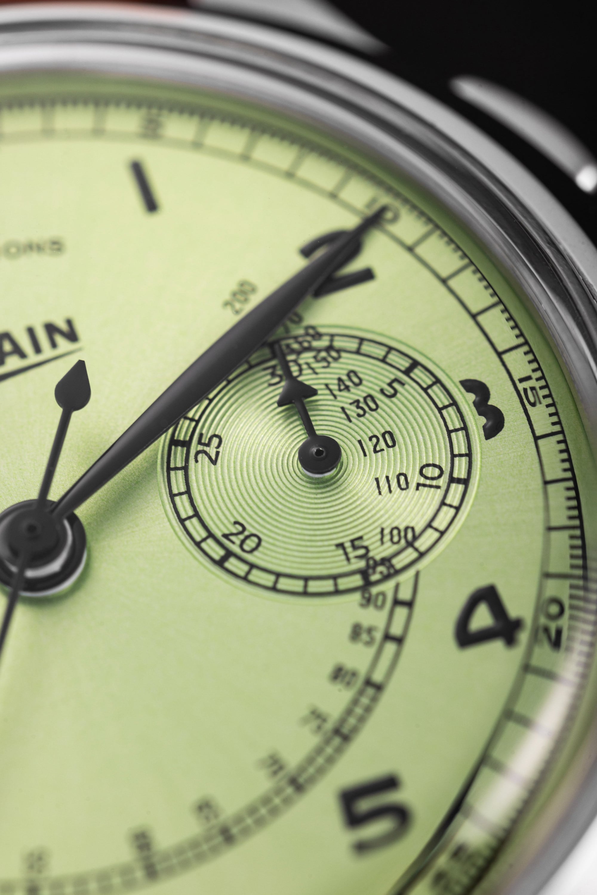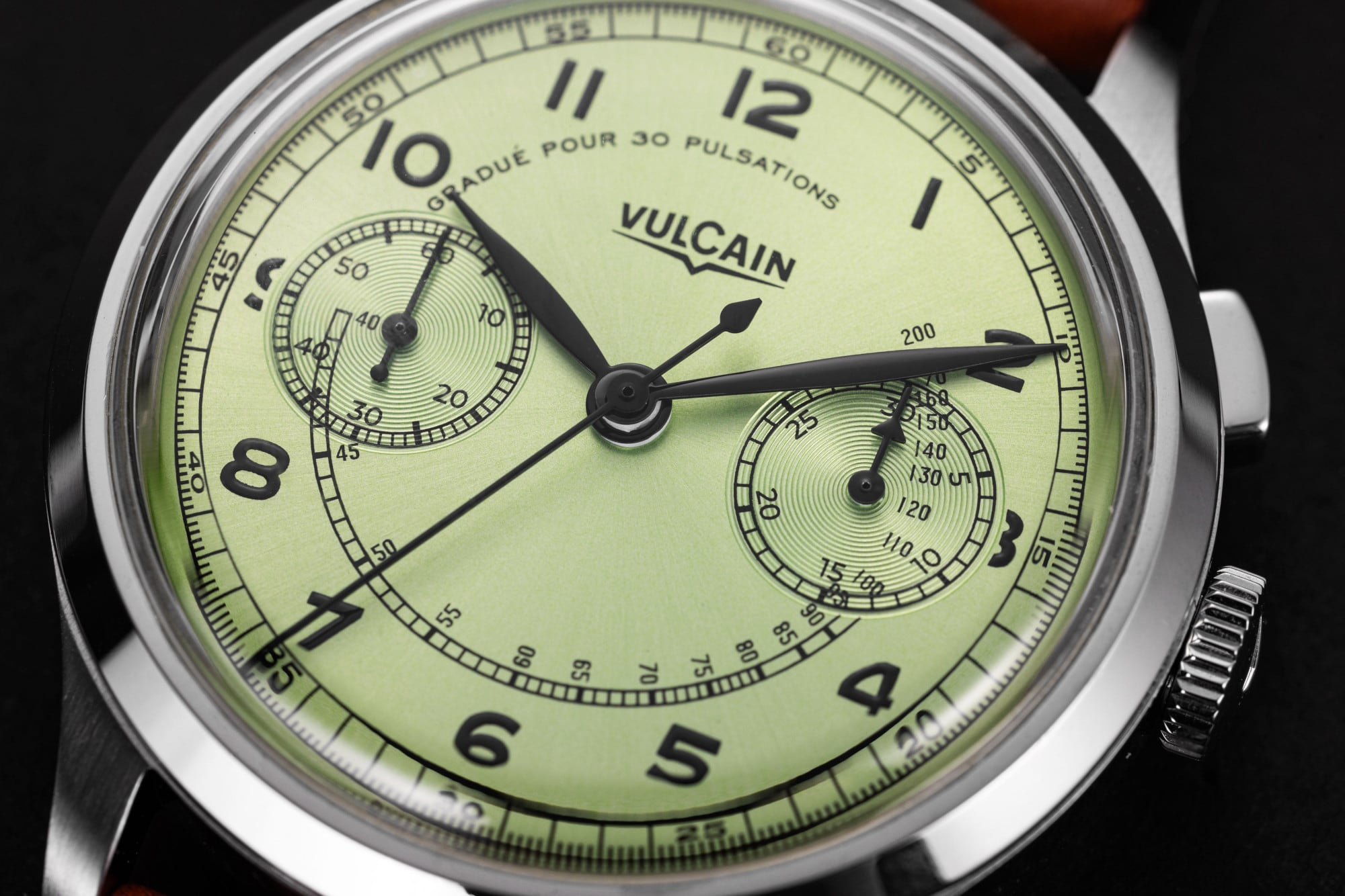 The sunburst green dial boasts the same polished silver numerals and hour-markers that adorned the original. Alongside the minute track, the dial also features a pulsometer scale marked "Graduated for 30 pulsations", staying faithful to the historical aesthetic.