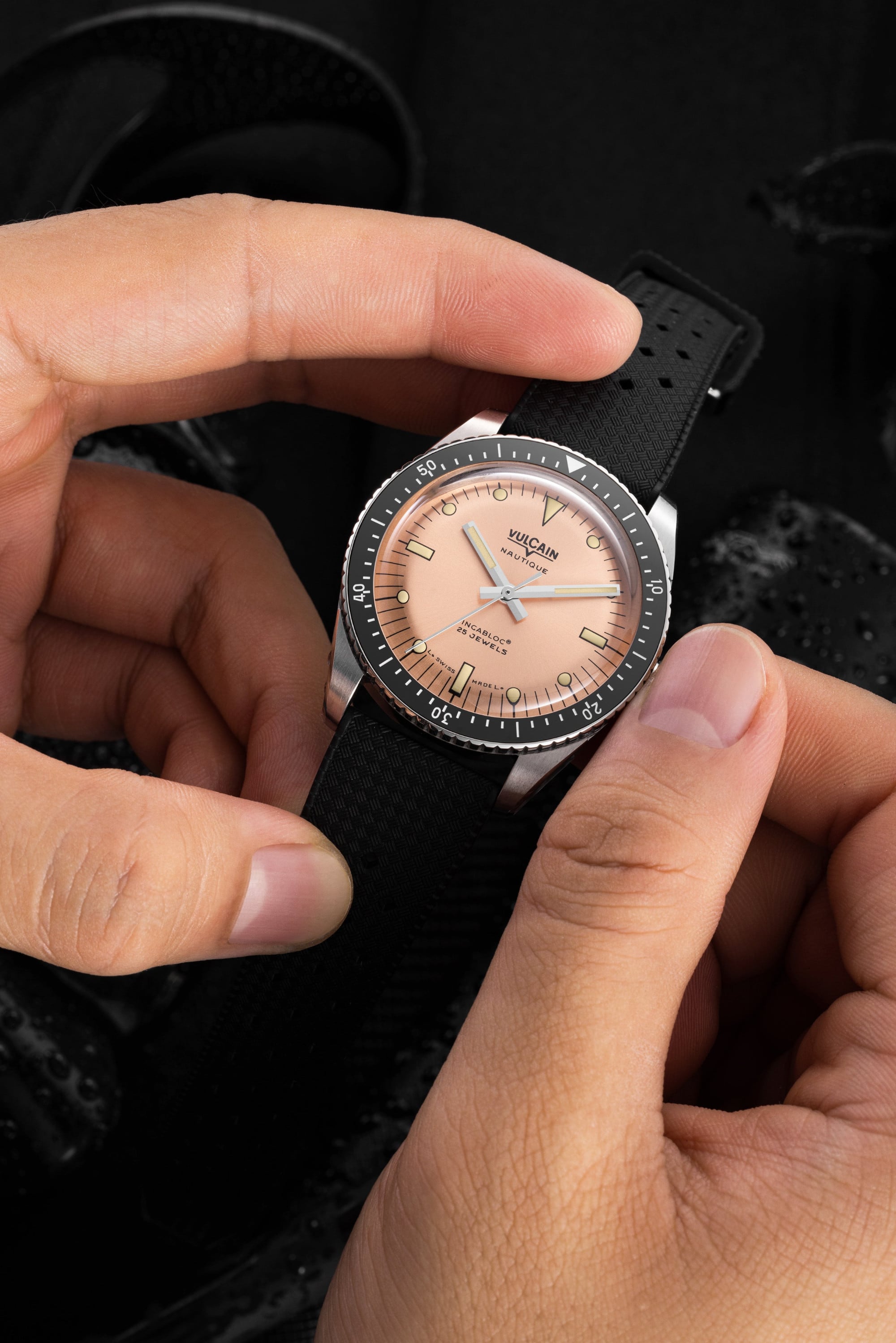 The Skindiver Nautique 38mm comes with a Salmon dial with black markings, indices with Beige Super‑Luminova; transfer-printed minute track and signature in beige, enhanced hands and hour markers. The leather strap with a black carbon pattern and matching stitching conveniently features a ‘quick-change’ system.