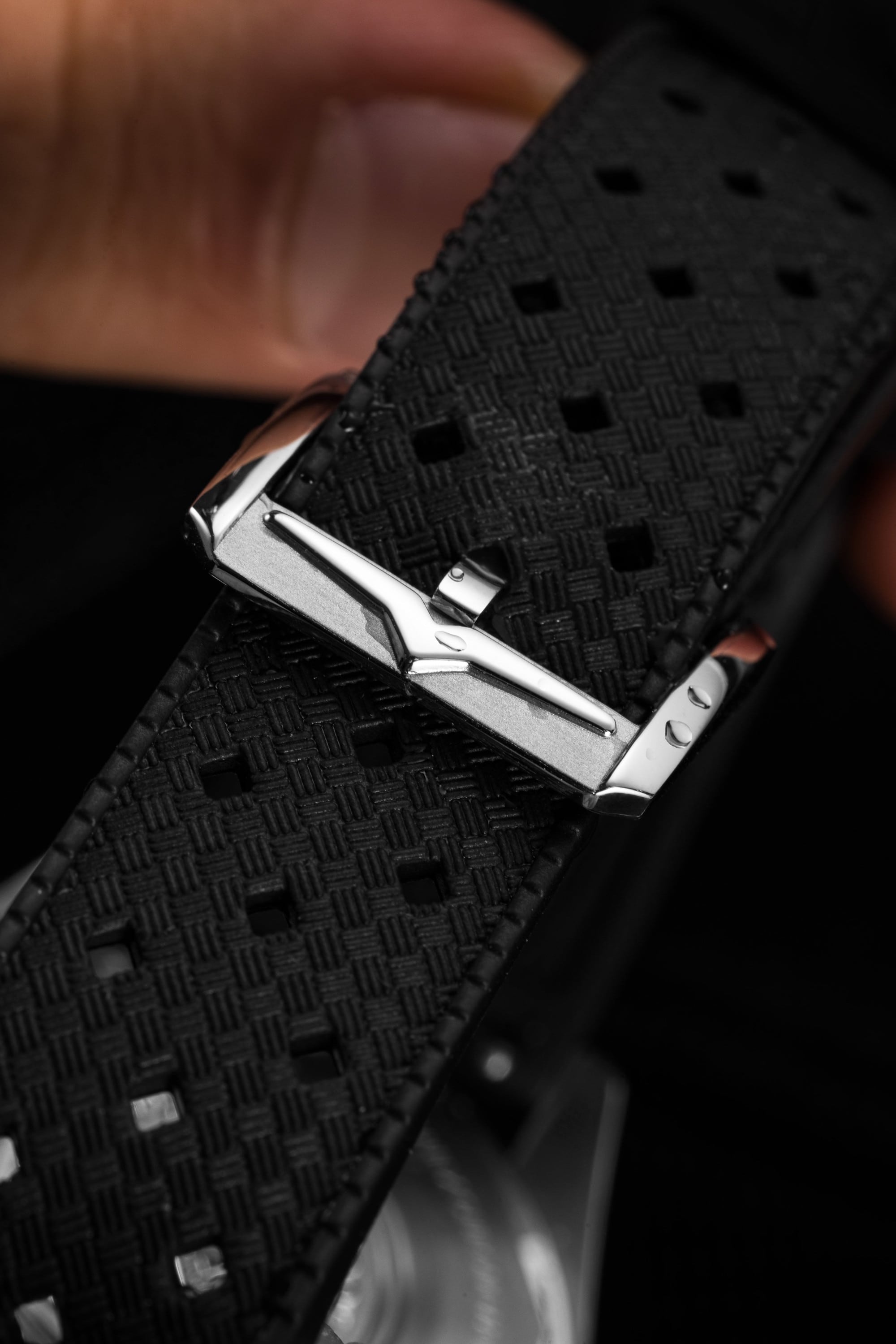 The Skindiver Nautique 38mm comes with a matte black dial with white transfer-printed minute track and signature, khaki brown Super-Luminova-enhanced hands and hour markers; the ‘quick-change’ strap is leather with a black carbon pattern and matching stitching.