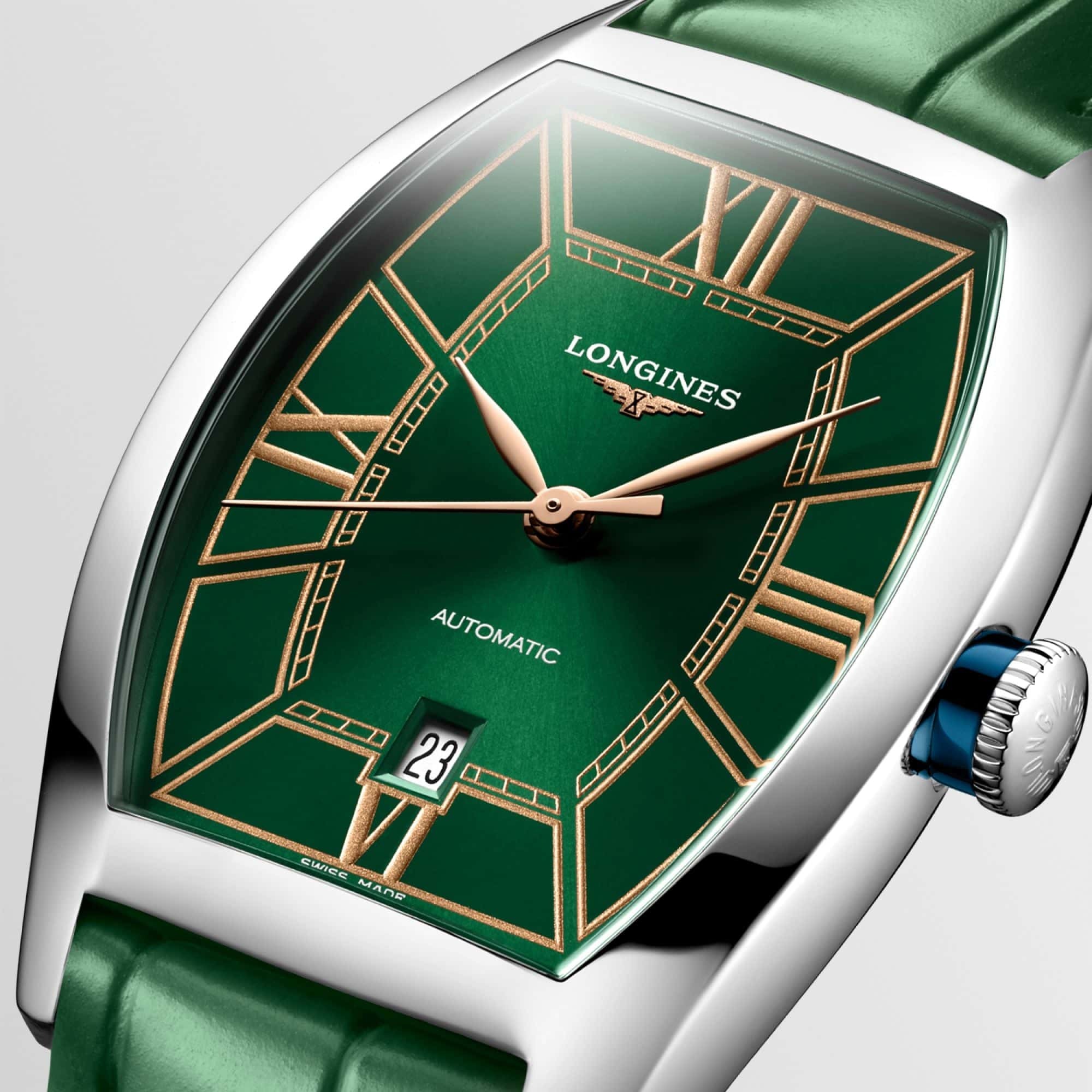 The Longines Evidenza Green Dial features a 26.00 X 30.60 mm stainless steel case. It's case is 8.70mm thick. The crystal used is a scratch-resistant sapphire, which is able to be utilized in direct sunlight. The dial is a Green dial. The hands are pink. The Longines Evidenza Green Dial functions include hours, minutes, seconds and date. Additionally, the L2.142.4.06.2 is water resistant for up to 30m, splash resistant. The movement is Longines automatic, caliber L592 with self-winding mechanical movement beating at 28'800 vibrations per hour, with a power reserve of approximately 45 hours. The timepiece sports a green alligator leather strap for ultimate comfort. The strap is finished with triple safety folding clasp and push-piece opening mechanism. When purchasing this watch, you’ll receive a 2 years warranty from Longines. The retail price for the Longines Evidenza Green Dial is $2,100.00 USD. This watch is available for purchase at Exquisite Timepieces.