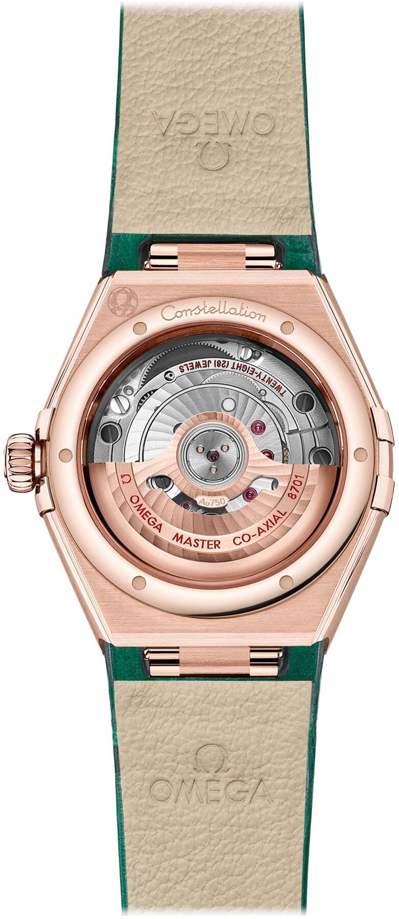 At the heart of this timepiece is the OMEGA Co-Axial Master Chronometer Calibre 8701, visible through the domed scratch-resistant sapphire crystal.