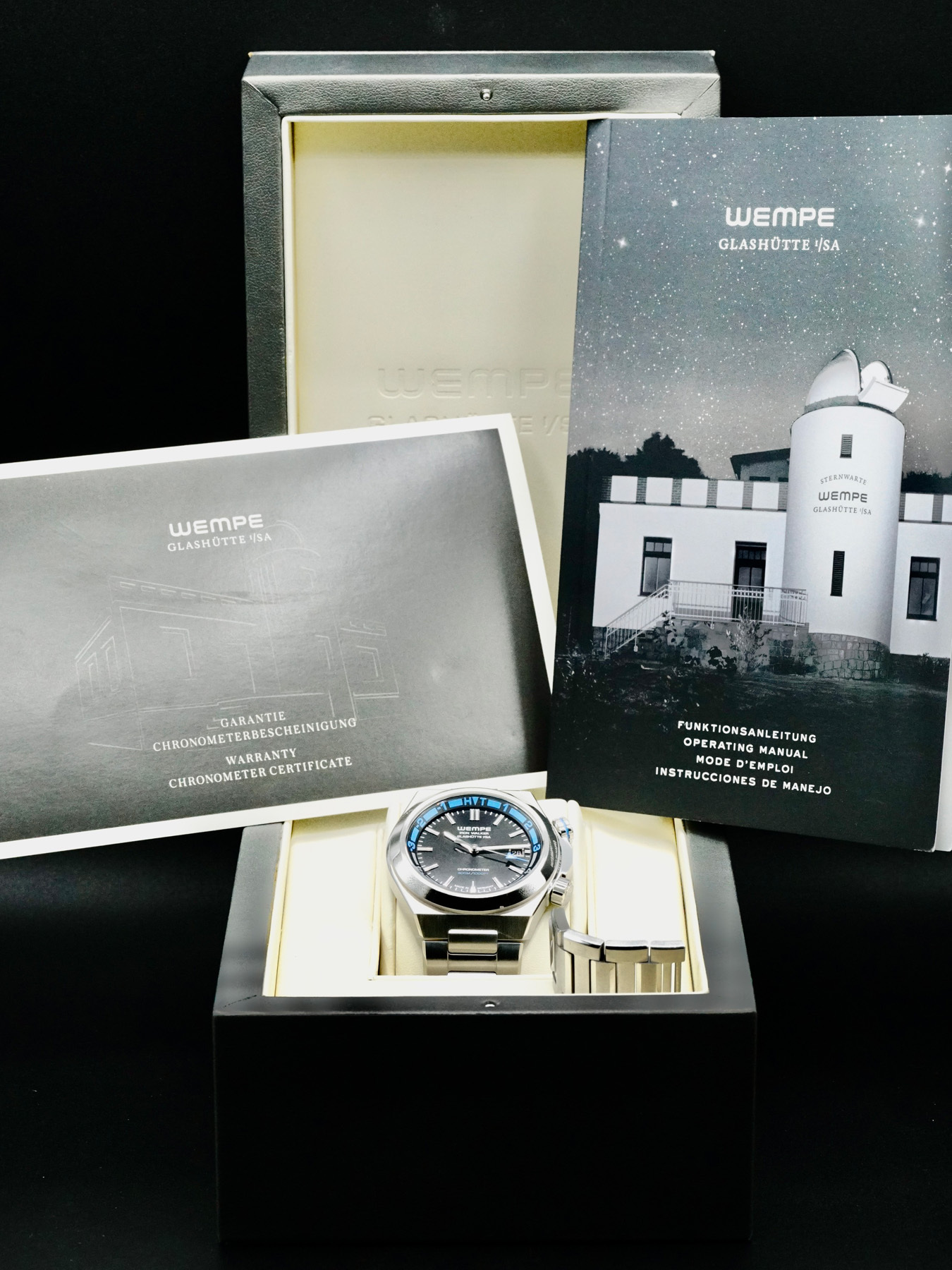 This Wempe Glashütte WI210001-002406 Iron Walker is in EXCELLENT condition. This watch includes original box and papers, instructions and warranty dated 2022. Extra stainless steel bracelet links.This watch has been fully authenticated and certified by Exquisite Timepieces.