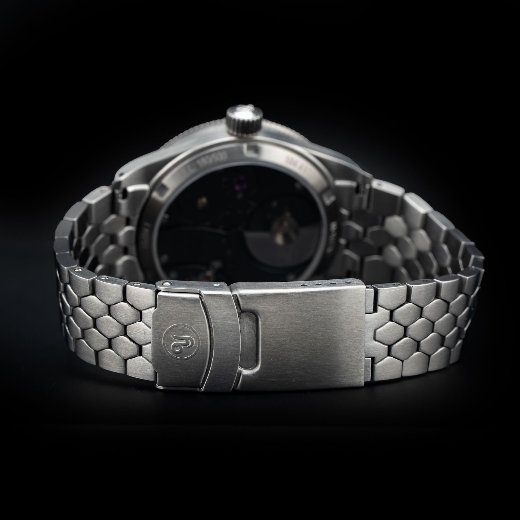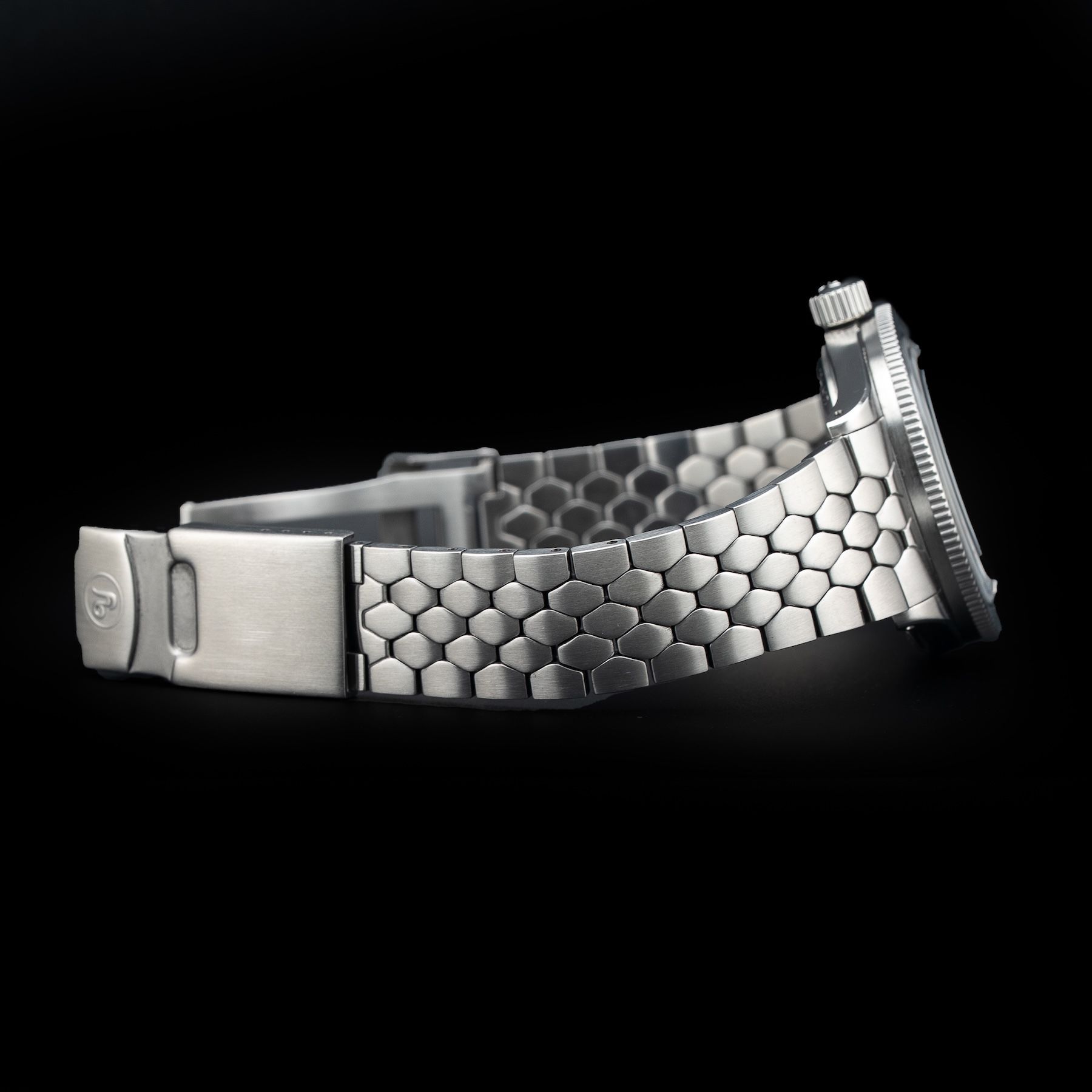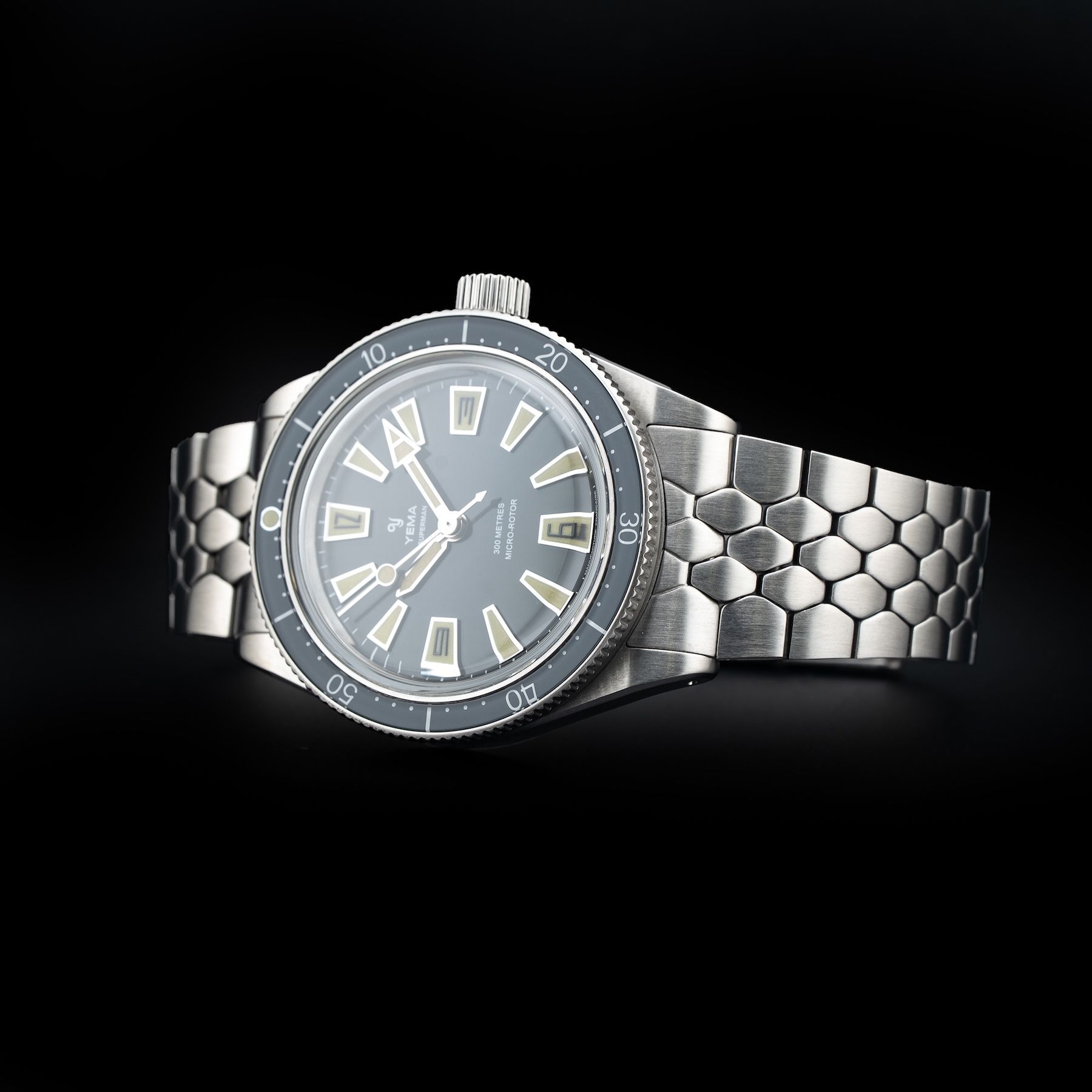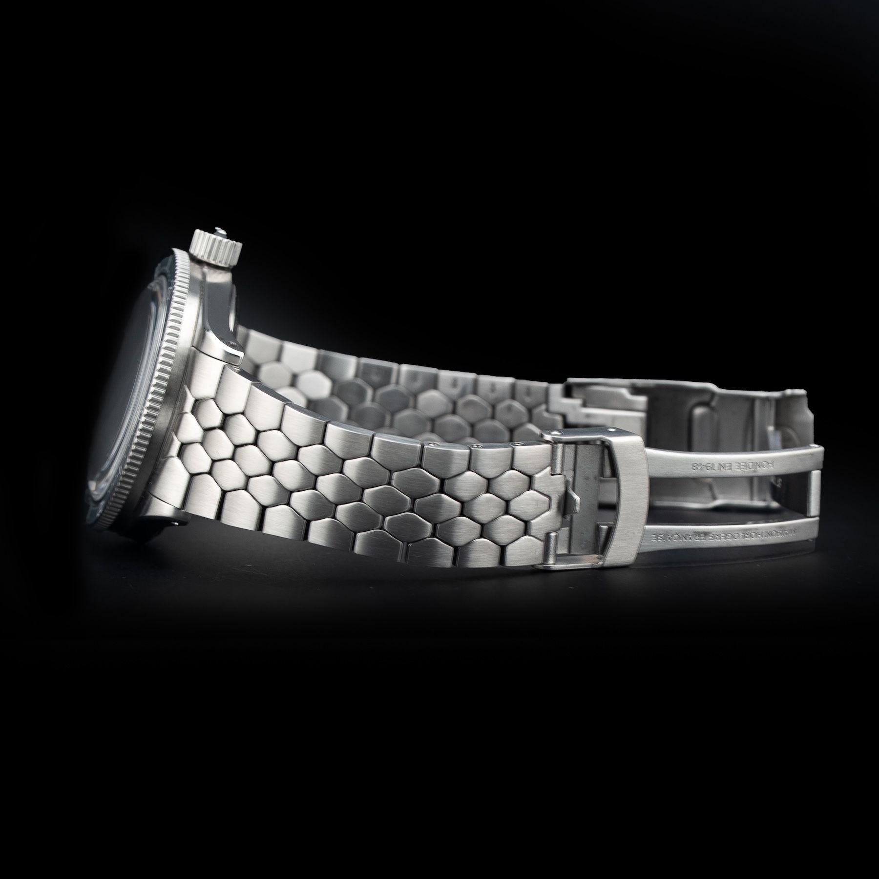 This watch features a 39mm stainless steel case on stainless steel bracelet. This watch also sports a gray dial. Powered by a self-winding movement. Water resistance up to 300 meters.