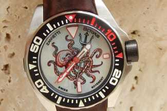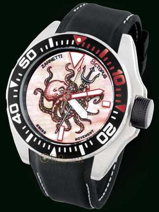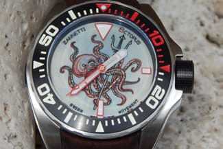 The 8CTOPUS wraps around the wrist and transforms itself into a perfect companion during dives down to considerable depths; specialists will no doubt appreciate the automatic helium valve, a distinguishing mark common to all the top diving watches. But it is with the dial that the 8CTOPUS shows off its most exciting features. Zannetti has transformed a drawing he has produced into a precious polychrome champleve decoration based on various marine shades of blue. The result is an exciting watch to be enjoyed daily and shown off with pride.
