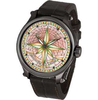 - This timepiece features a 47mm steel case paired with a high quality leather strap. It showcases a distinctive multicolor dial and is powered by a precise automatic winding movement. The watch is designed with a water resistance of up to 50m.