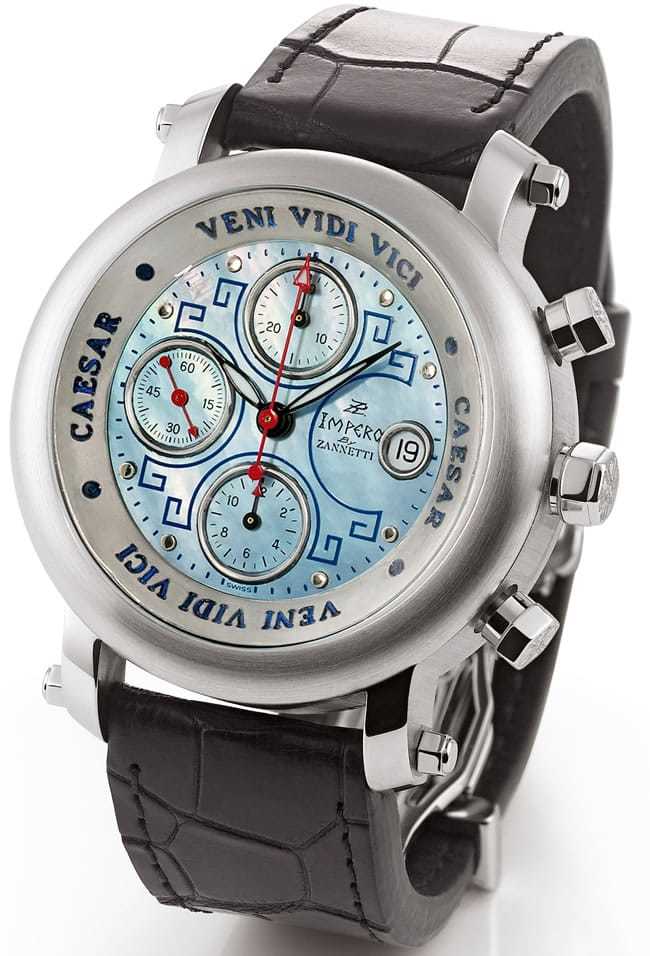 - This timepiece features a 44mm steel case paired with a high quality leather strap. It showcases a distinctive mother of pearl dial and is powered by a precise automatic winding movement. The watch is designed with a water resistance of up to 50m.