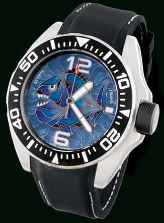 Fine-brushed Fine-brushed steel with polished edges, carrure surface black PVD treatment; Ø 51,30; 16 mm thickness; unidirectional turning bezel in finebrushed steel with a black aluminium ring, luminescent pointer and white minute track for the calculation of diving times. steel with polished edges, carrure surface black PVD treatment; Ø 51,30; 16 mm thickness; unidirectional turning bezel in finebrushed steel with a black aluminium ring, luminescent pointer and white minute track for the calculation of diving times. Screw-in case back with 'Zannetti official Scuba Diving' logo. Automatic helium valve at 9.