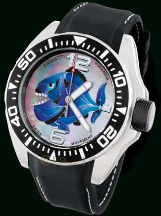steel with polished edges, carrure surface black PVD treatment; Ø 51,30; 16 mm thickness; unidirectional turning bezel in finebrushed steel with a black aluminium ring, luminescent pointer and white minute track for the calculation of diving times. Screw-in case back with 'Zannetti official Scuba Diving' logo. Automatic helium valve at 9.
