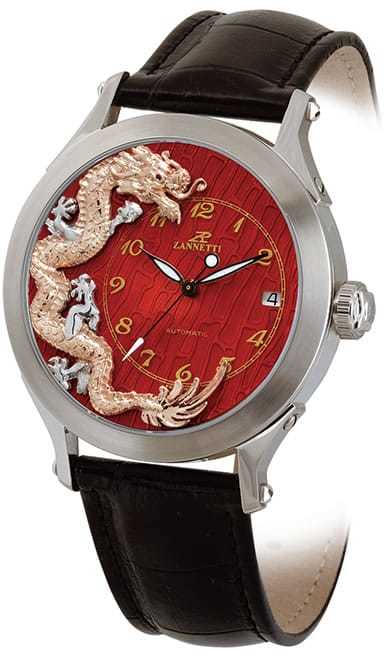 translucent colored red enamel, figure in bas-relief totally handmade in 18kt dial