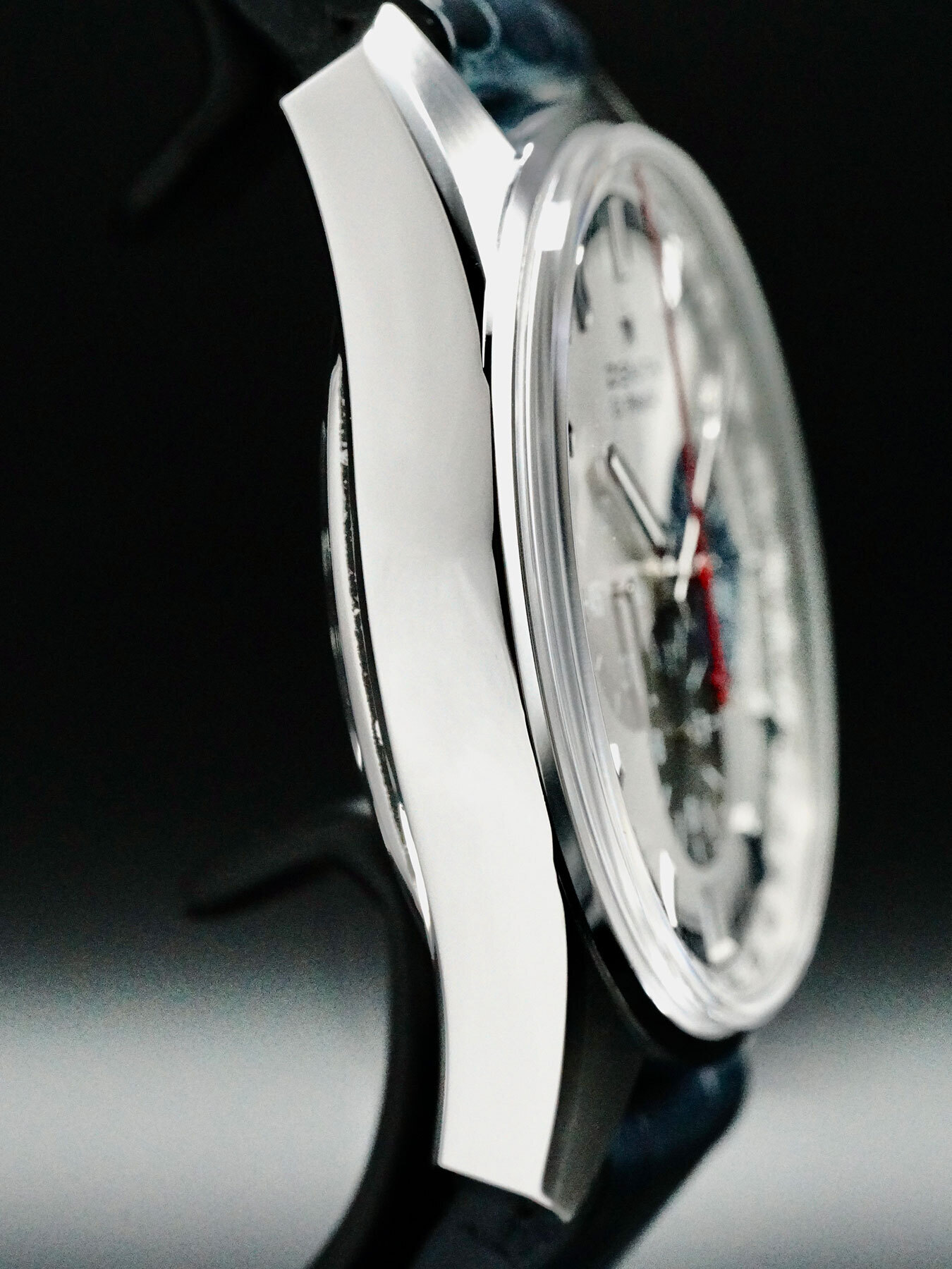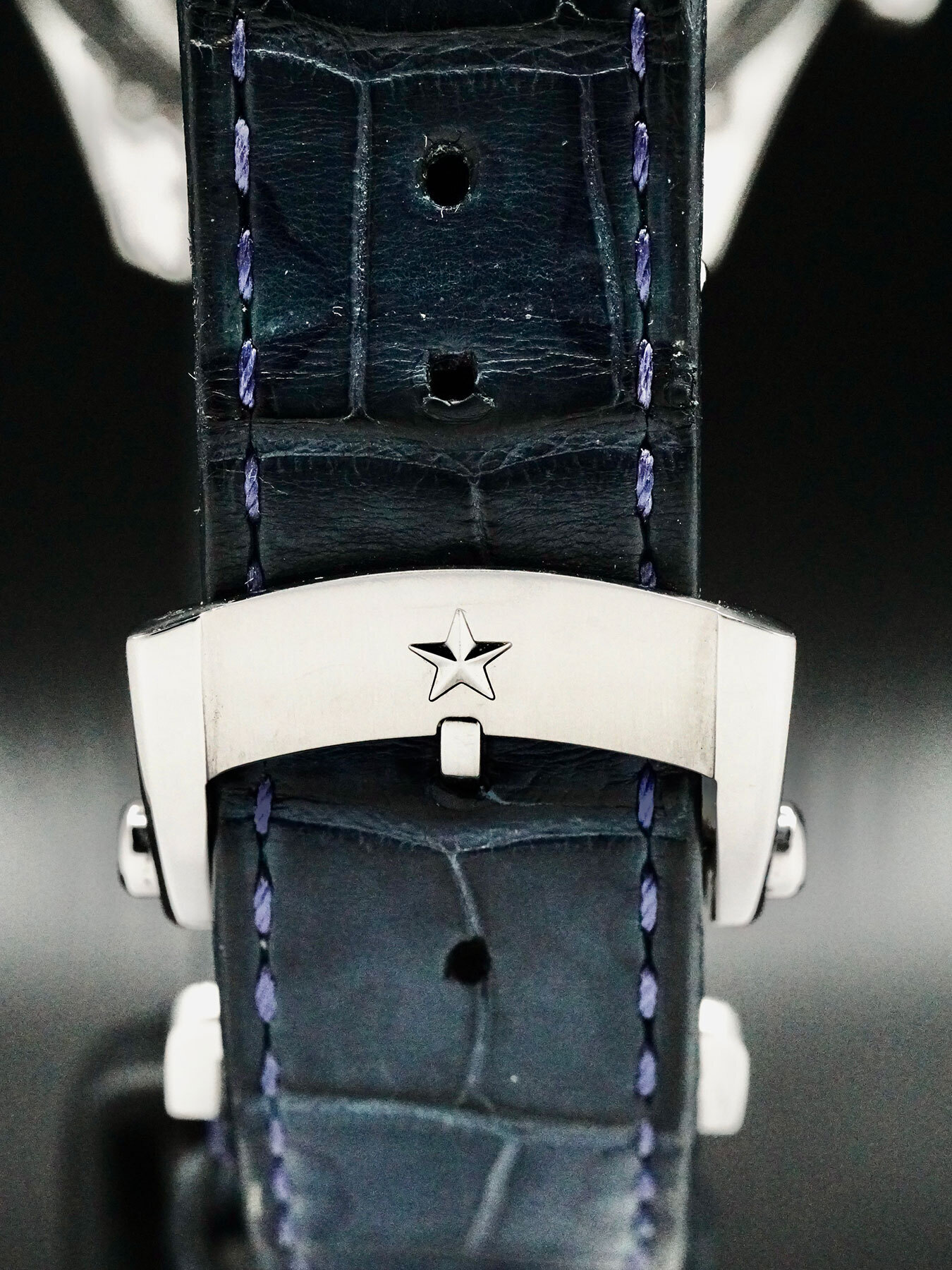 This Zenith Chronomaster El Primero features a 42mm stainless steel case with a display case back on a blue leather strap. This watch also sports a silver dial with luminous silver-tone hands and index dial markers covered by scratch resistant sapphire crystal.